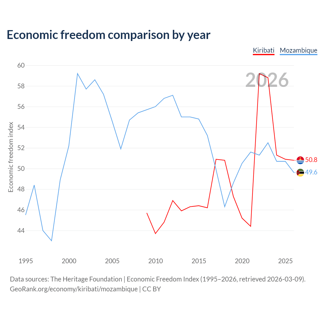The Economic Freedom Index for Kiribati is 50.8, ranking 158/197, compared to 49.6 for Mozambique, ranking 164/197. The chart above displays a comparison of annual changes in economic freedom indexes.
