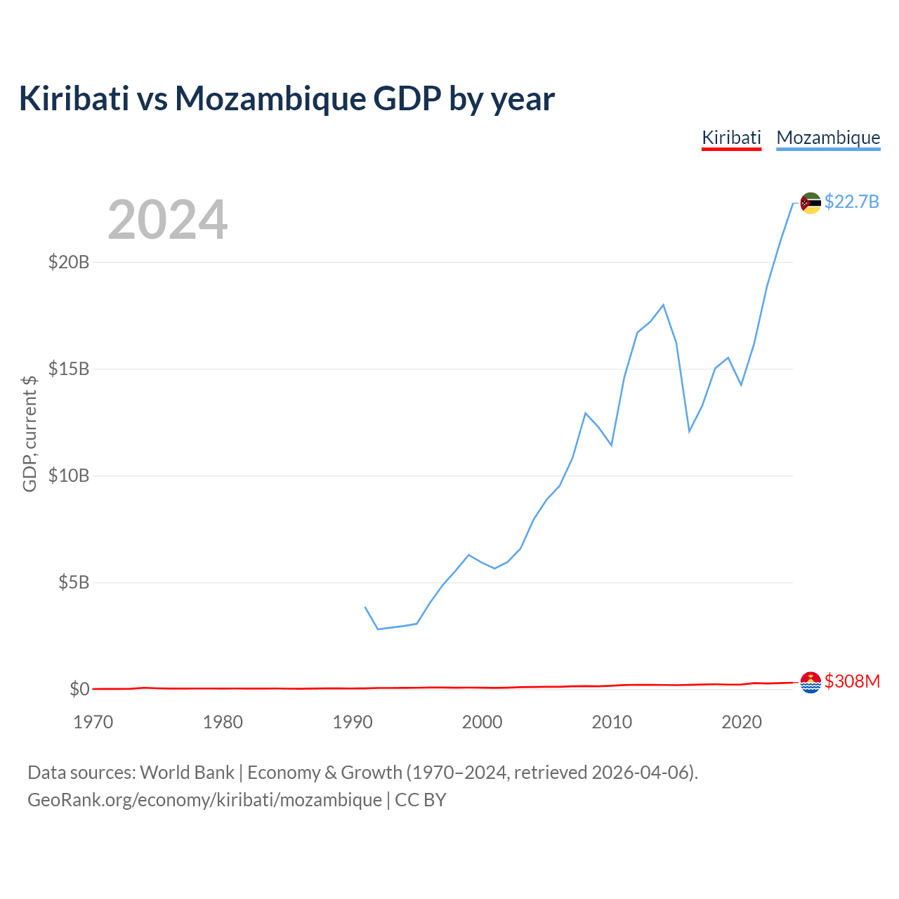 Kiribati has a GDP of $308M compared to $22.7B for Mozambique, ranking 192/197 and 123/197 by economy size, respectively.