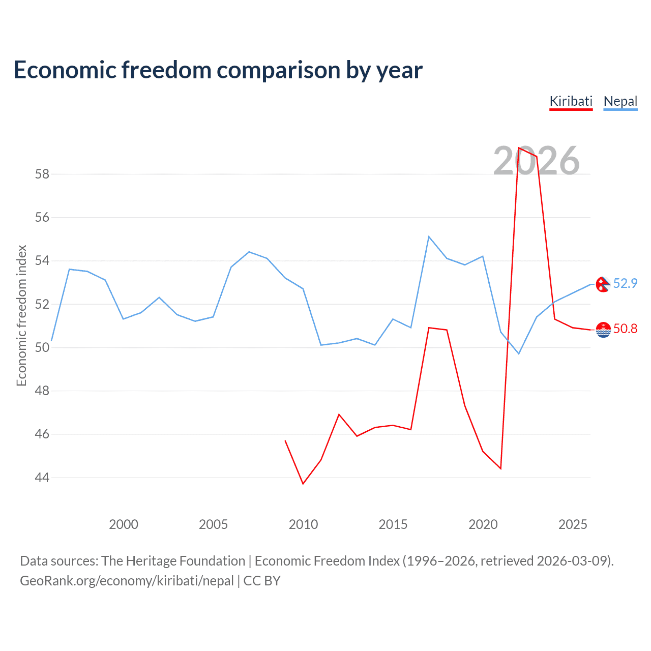 The Economic Freedom Index for Kiribati is 50.8, ranking 158/197, compared to 52.9 for Nepal, ranking 144/197. The chart above displays a comparison of annual changes in economic freedom indexes.