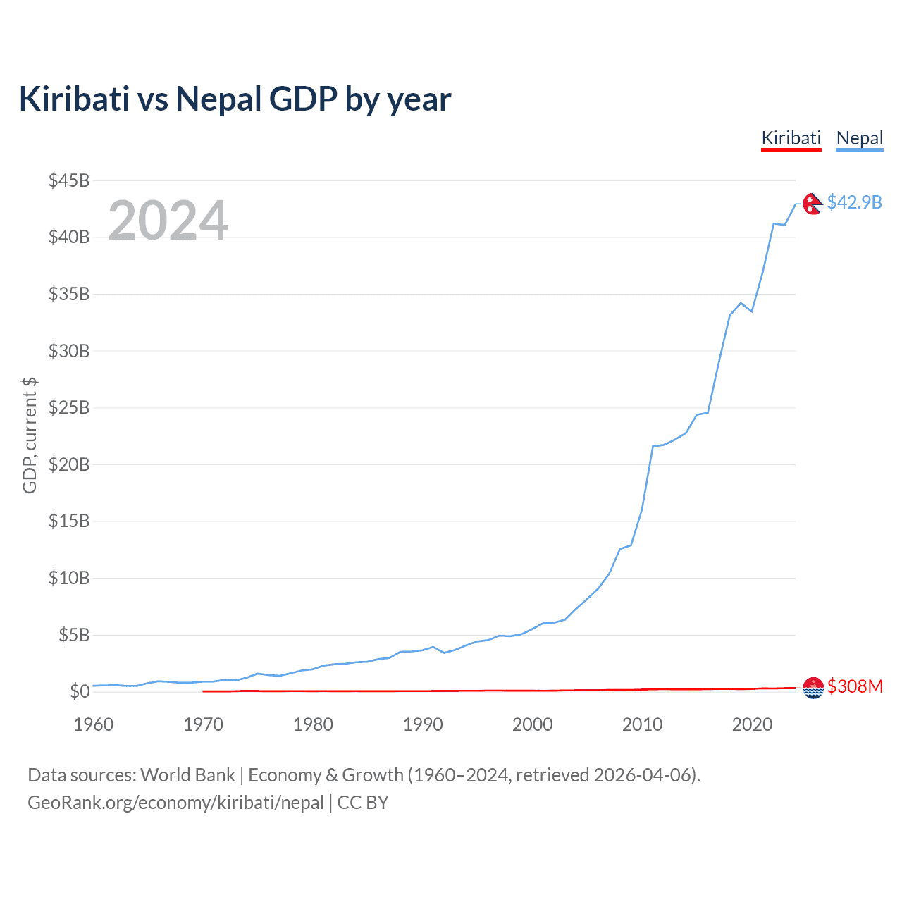 Kiribati has a GDP of $308M compared to $42.9B for Nepal, ranking 192/197 and 101/197 by economy size, respectively.