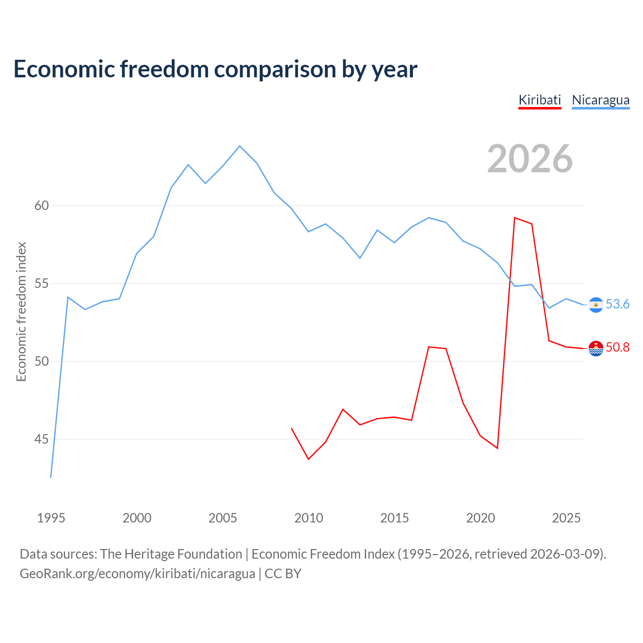 The Economic Freedom Index for Kiribati is 50.8, ranking 158/197, compared to 53.6 for Nicaragua, ranking 139/197. The chart above displays a comparison of annual changes in economic freedom indexes.