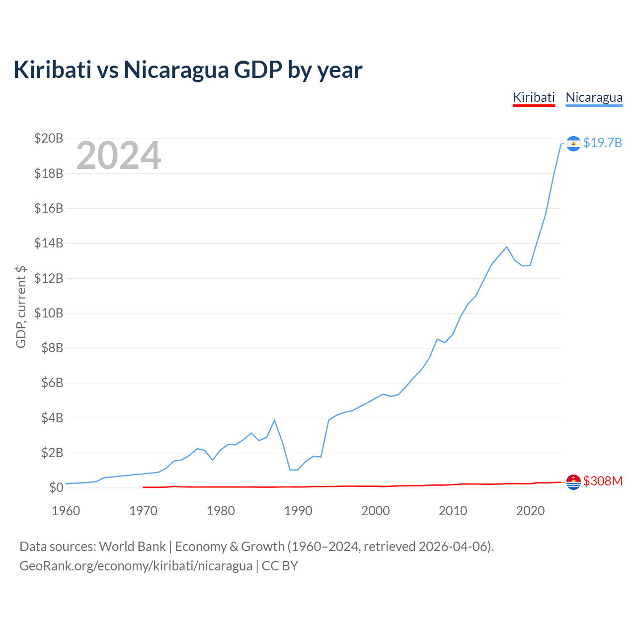 Kiribati has a GDP of $308M compared to $19.7B for Nicaragua, ranking 192/197 and 131/197 by economy size, respectively.