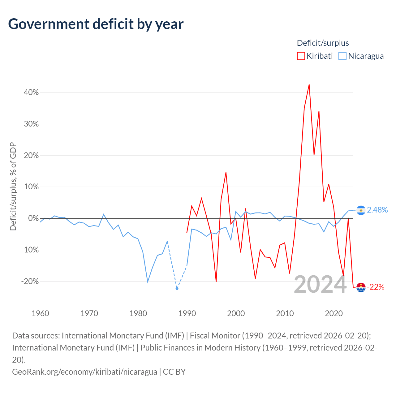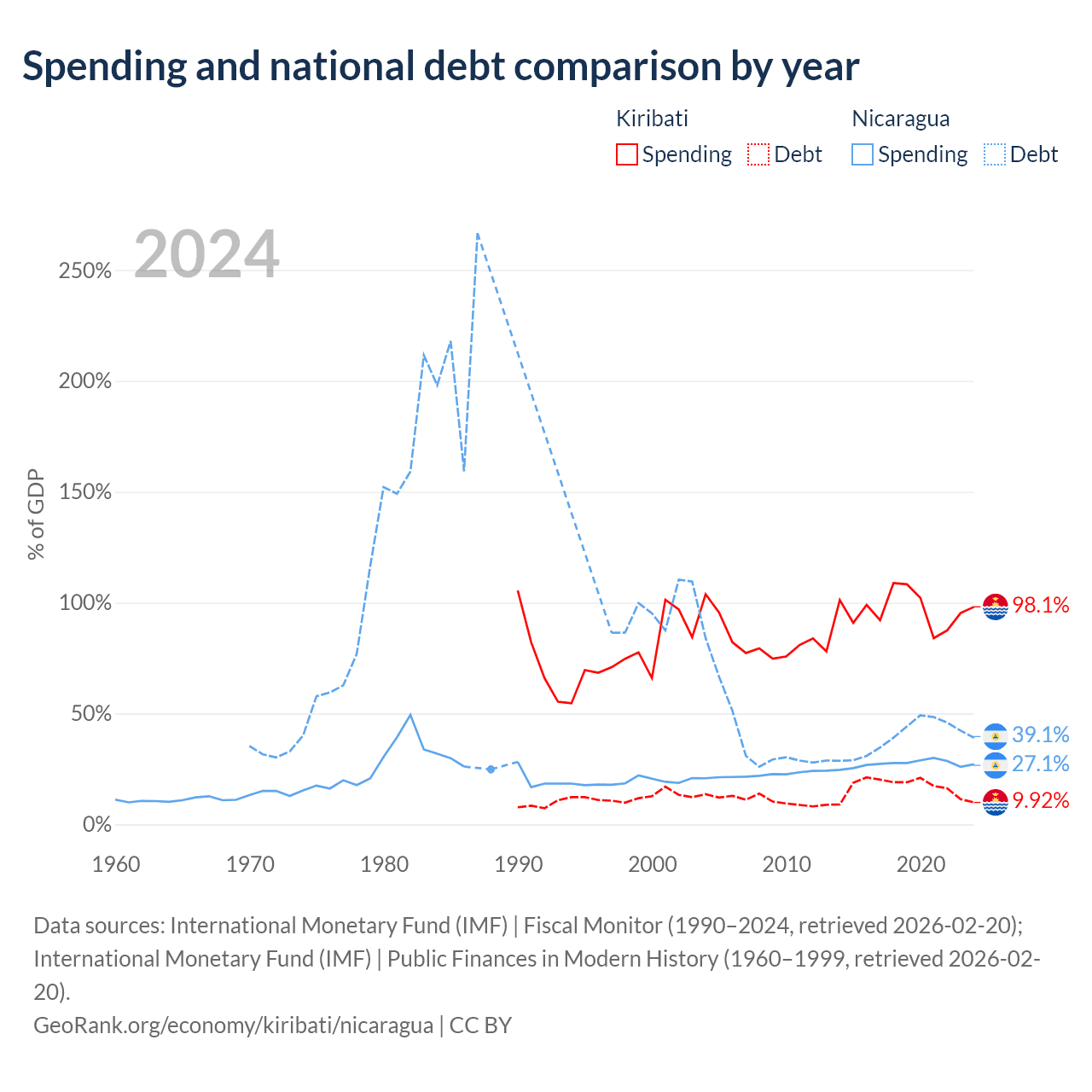 Kiribati has $30.5M in government debt (9.92% of GDP), compared to $7.71B (39.1% of GDP) in Nicaragua.