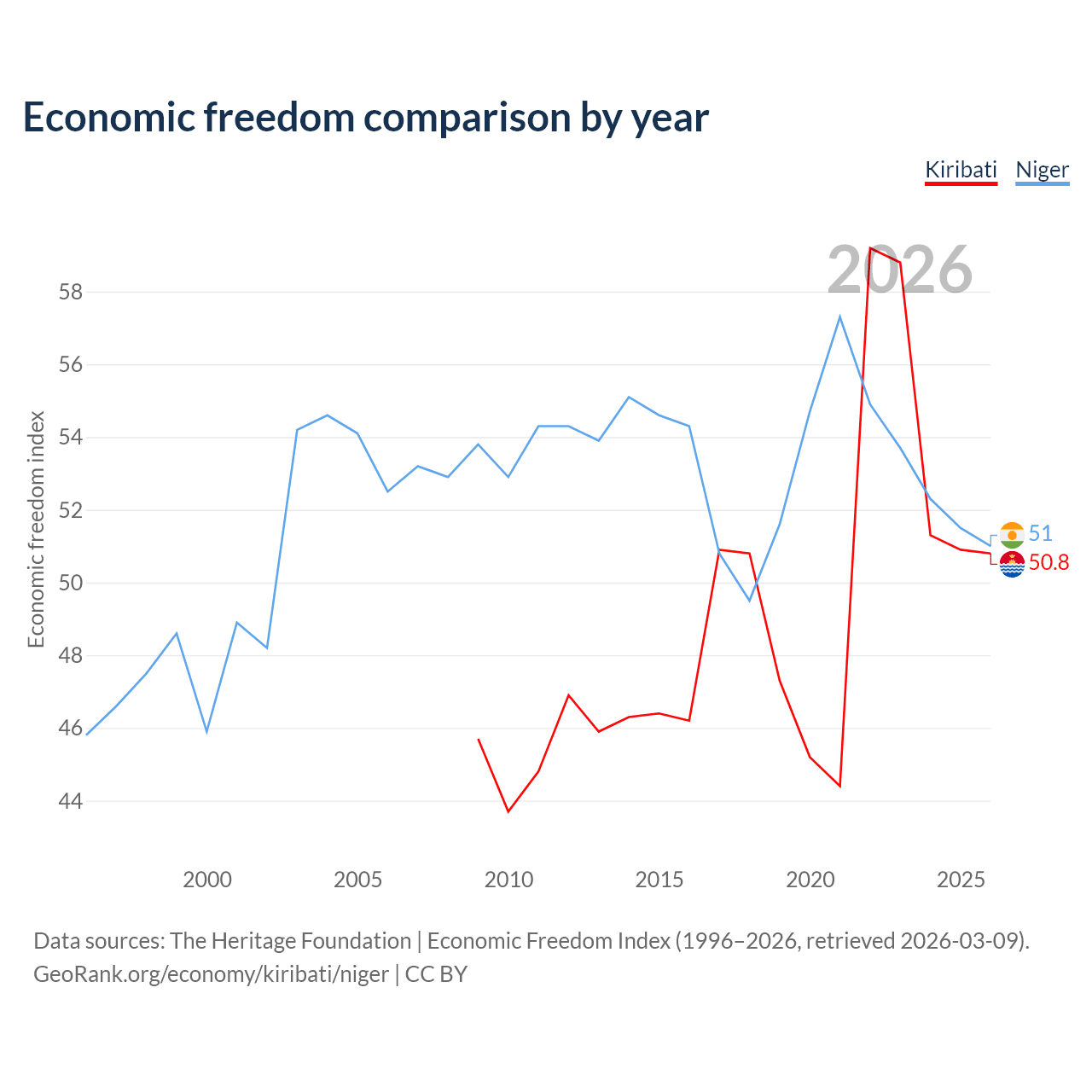 The Economic Freedom Index for Kiribati is 50.8, ranking 158/197, compared to 51 for Niger, ranking 156/197. The chart above displays a comparison of annual changes in economic freedom indexes.