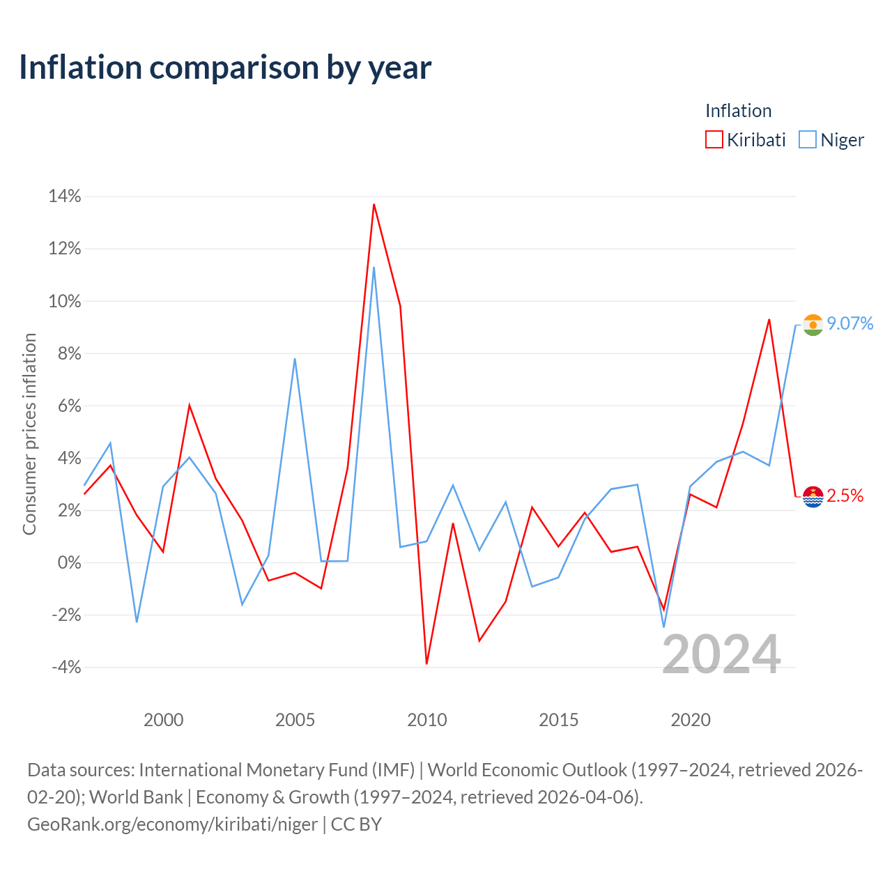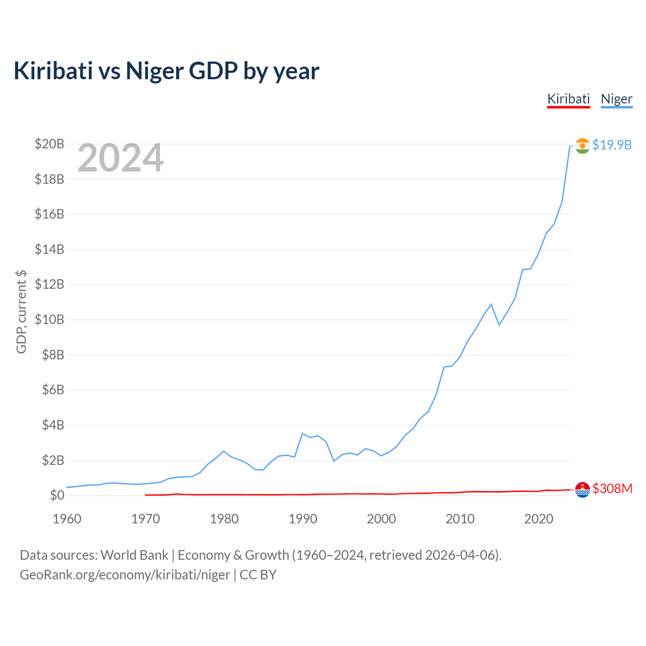 Kiribati has a GDP of $308M compared to $19.9B for Niger, ranking 192/197 and 130/197 by economy size, respectively.