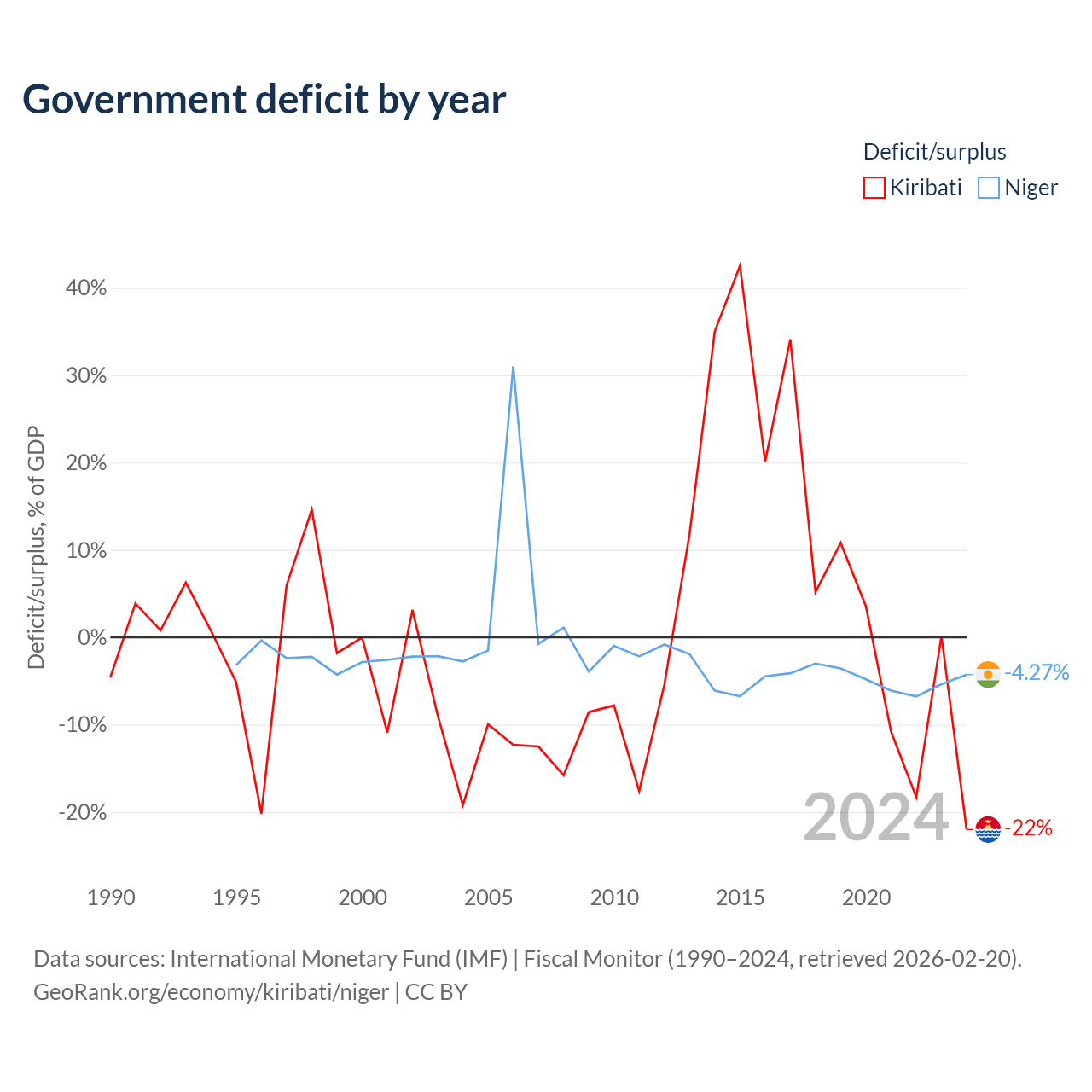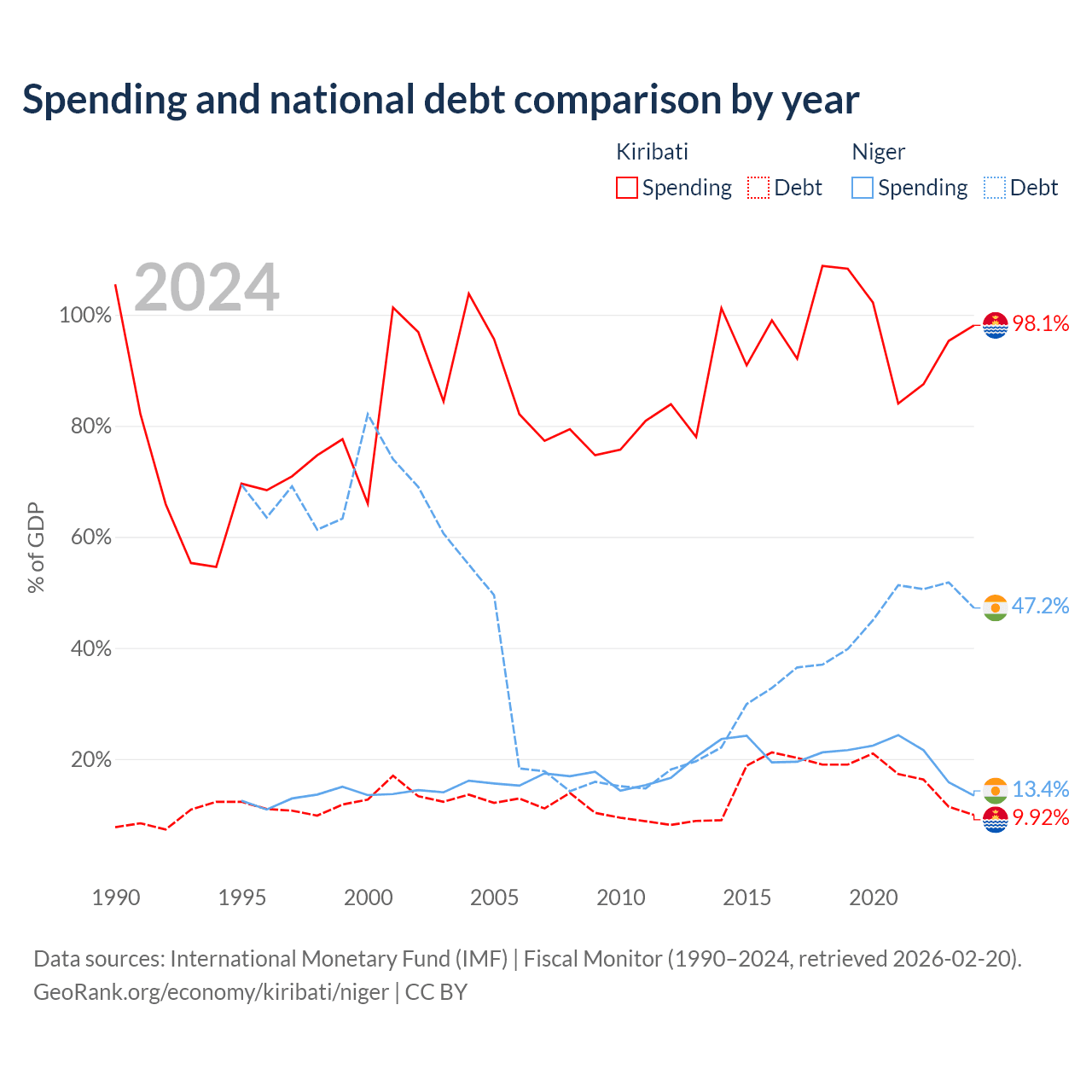 Kiribati has $30.5M in government debt (9.92% of GDP), compared to $9.39B (47.2% of GDP) in Niger.