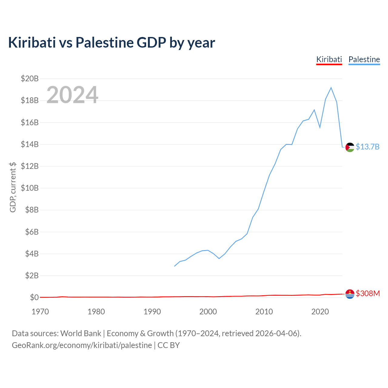 Kiribati has a GDP of $308M compared to $13.7B for Palestine, ranking 192/197 and 146/197 by economy size, respectively.