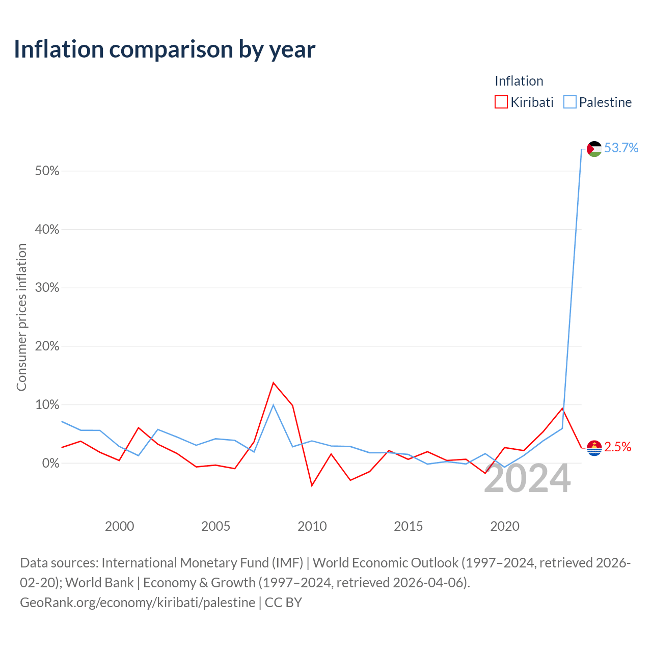 Over the past 28 years, Kiribati has recorded an average annual inflation rate of 2.25%, compared with 4.9% in Palestine. In 2024, inflation was 2.5% in Kiribati and 53.7% in Palestine.