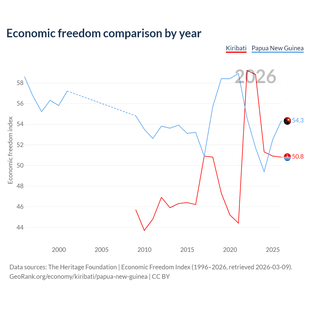 The Economic Freedom Index for Kiribati is 50.8, ranking 158/197, compared to 54.3 for Papua New Guinea, ranking 134/197. The chart above displays a comparison of annual changes in economic freedom indexes.