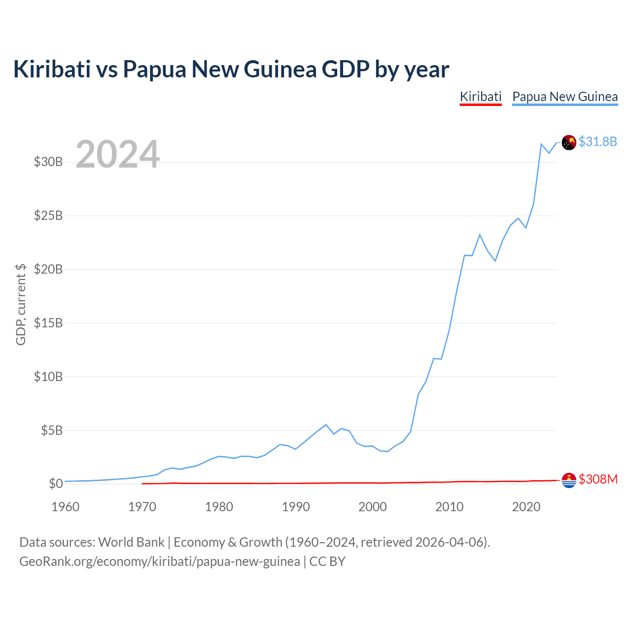 Kiribati has a GDP of $308M compared to $31.8B for Papua New Guinea, ranking 192/197 and 110/197 by economy size, respectively.
