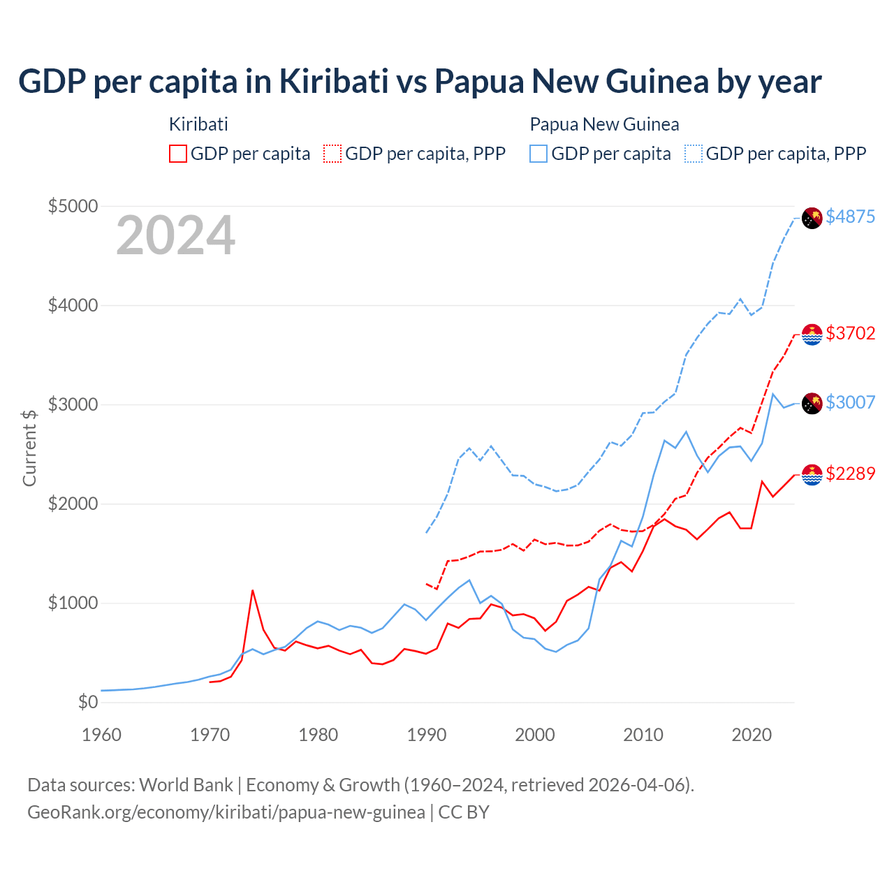 GDP per capita in Kiribati vs Papua New Guinea by year