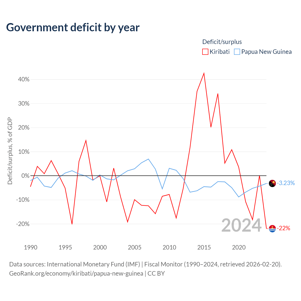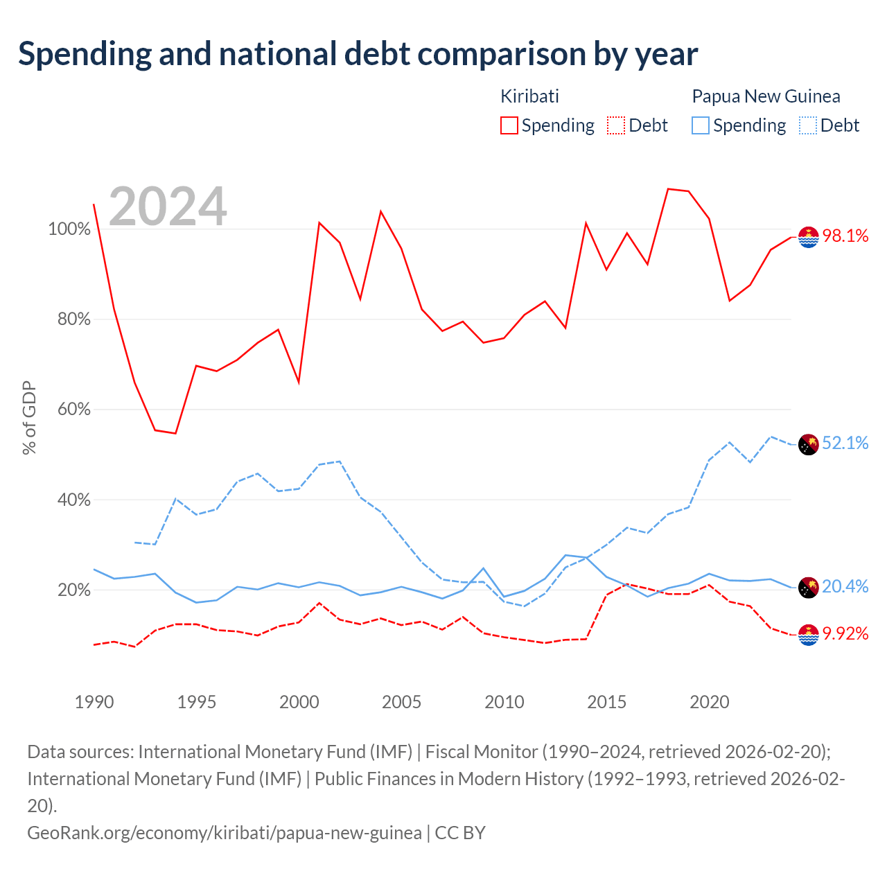 Kiribati has $30.5M in government debt (9.92% of GDP), compared to $16.6B (52.1% of GDP) in Papua New Guinea.