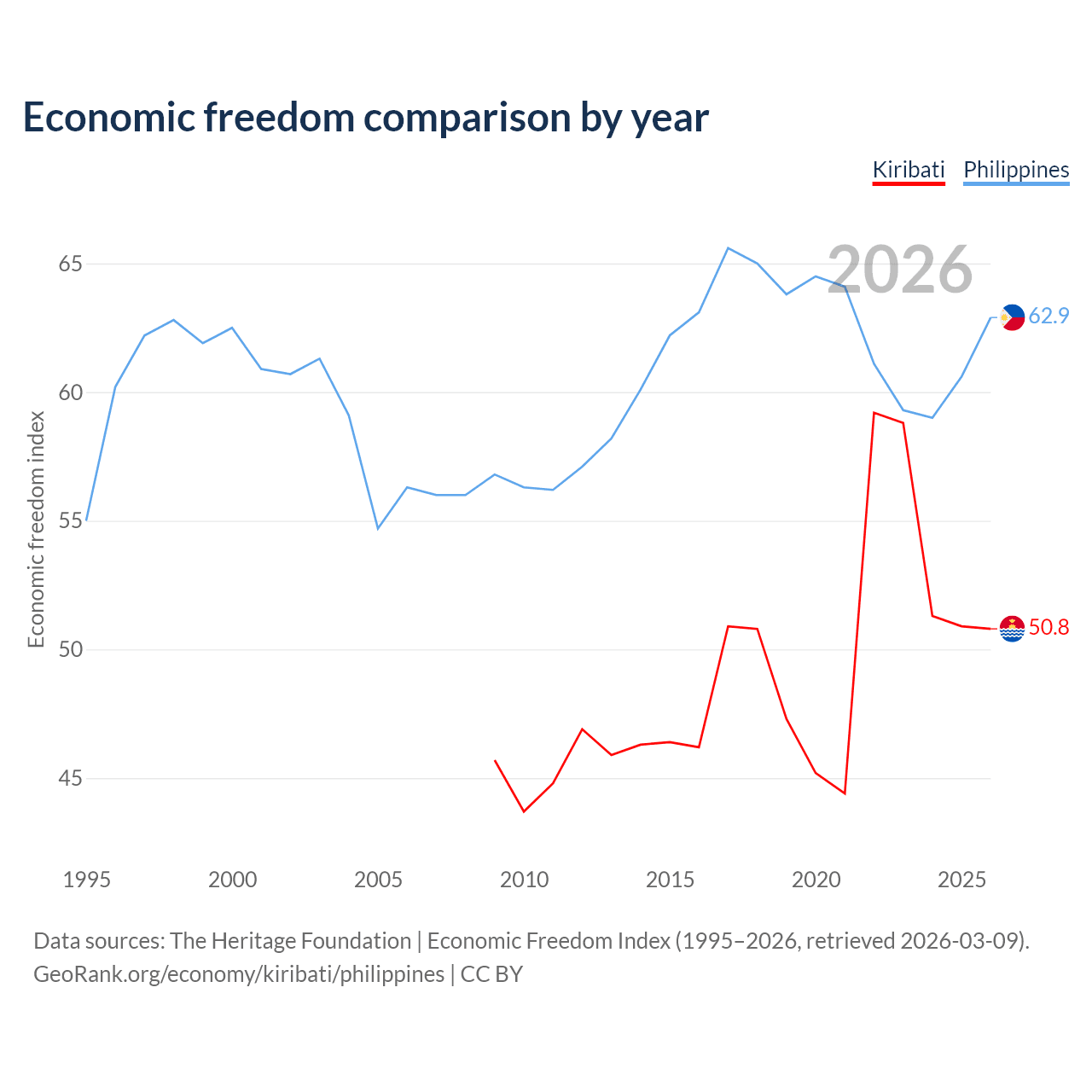 The Economic Freedom Index for Kiribati is 50.8, ranking 158/197, compared to 62.9 for the Philippines, ranking 85/197. The chart above displays a comparison of annual changes in economic freedom indexes.