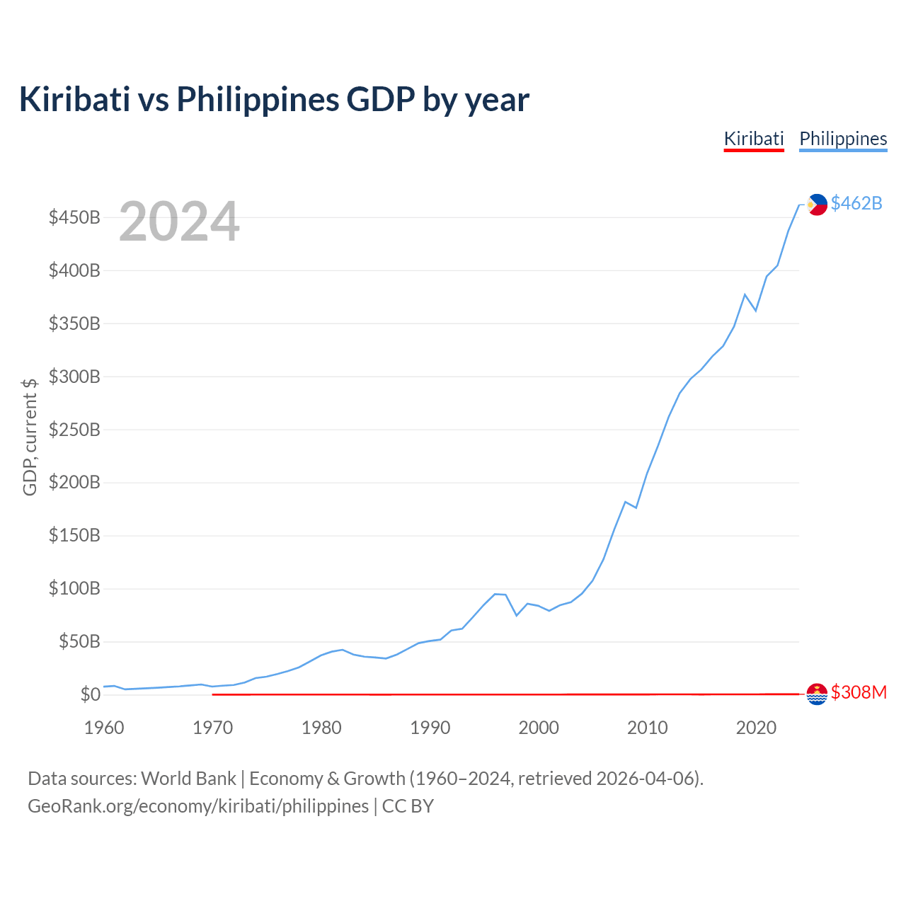 Kiribati has a GDP of $308M compared to $462B for the Philippines, ranking 192/197 and 35/197 by economy size, respectively.