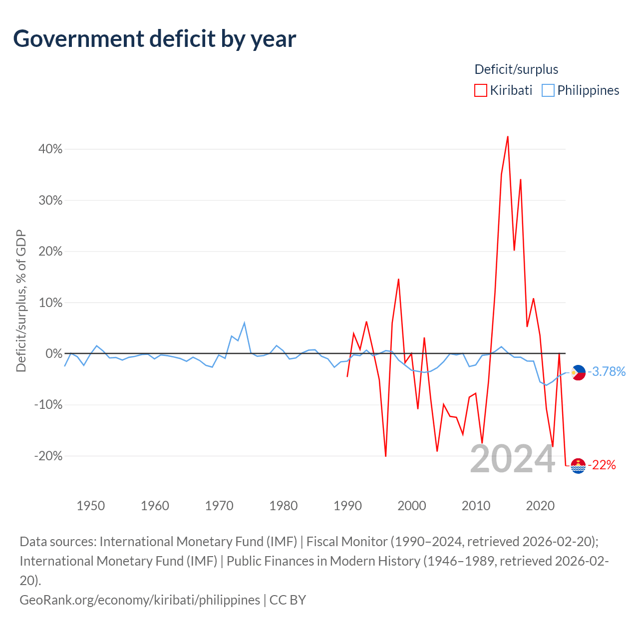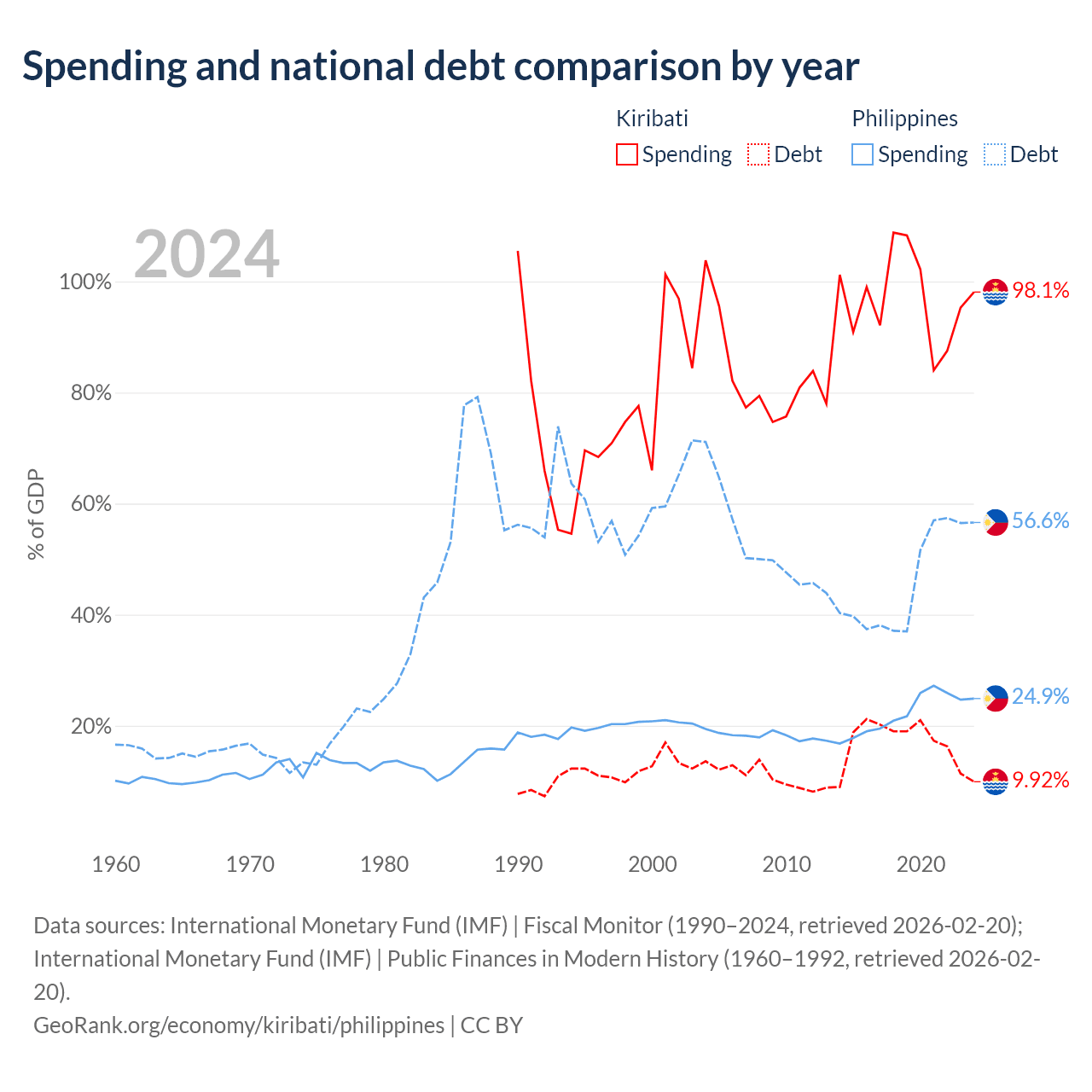 Kiribati has $30.5M in government debt (9.92% of GDP), compared to $261B (56.6% of GDP) in the Philippines.