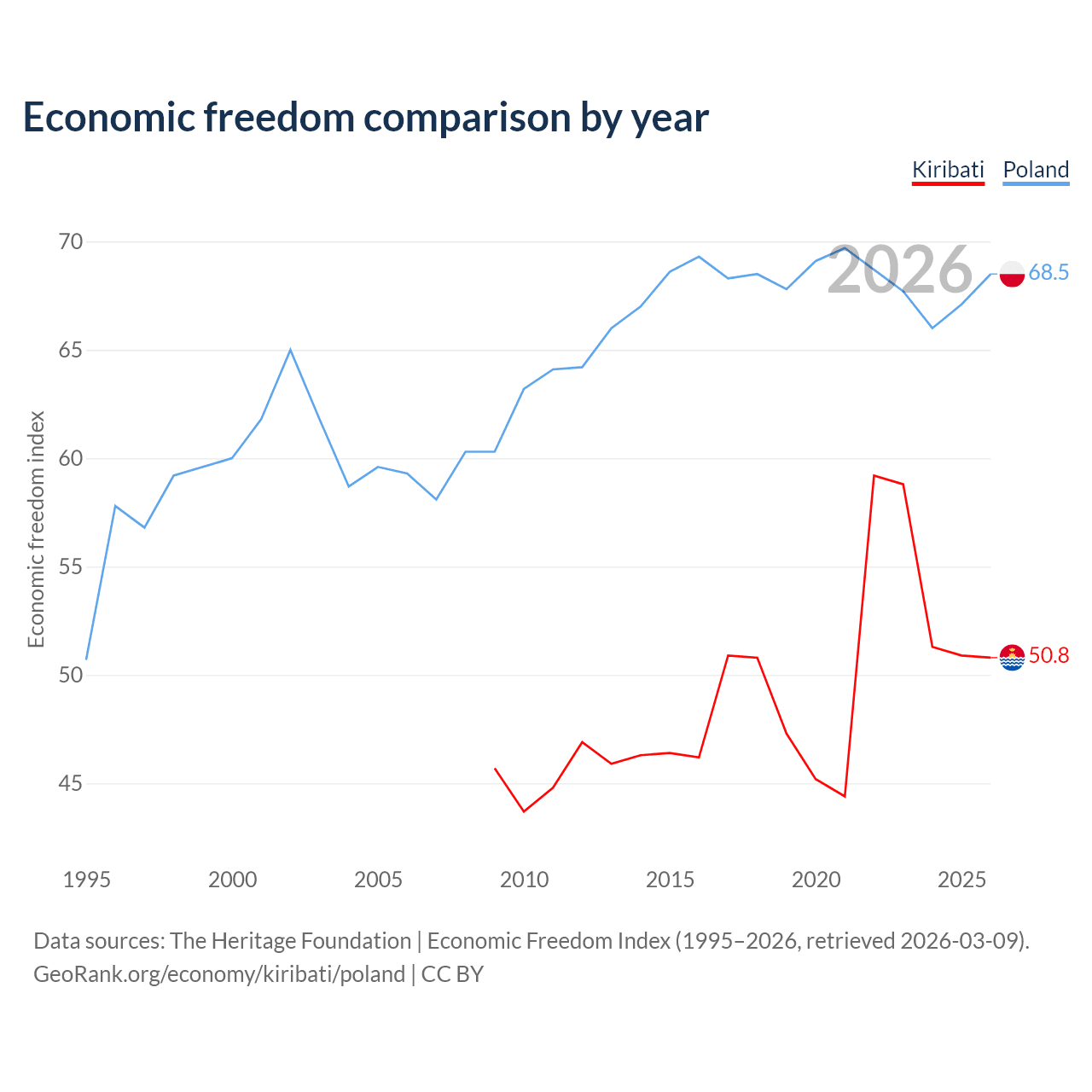 The Economic Freedom Index for Kiribati is 50.8, ranking 158/197, compared to 68.5 for Poland, ranking 46/197. The chart above displays a comparison of annual changes in economic freedom indexes.