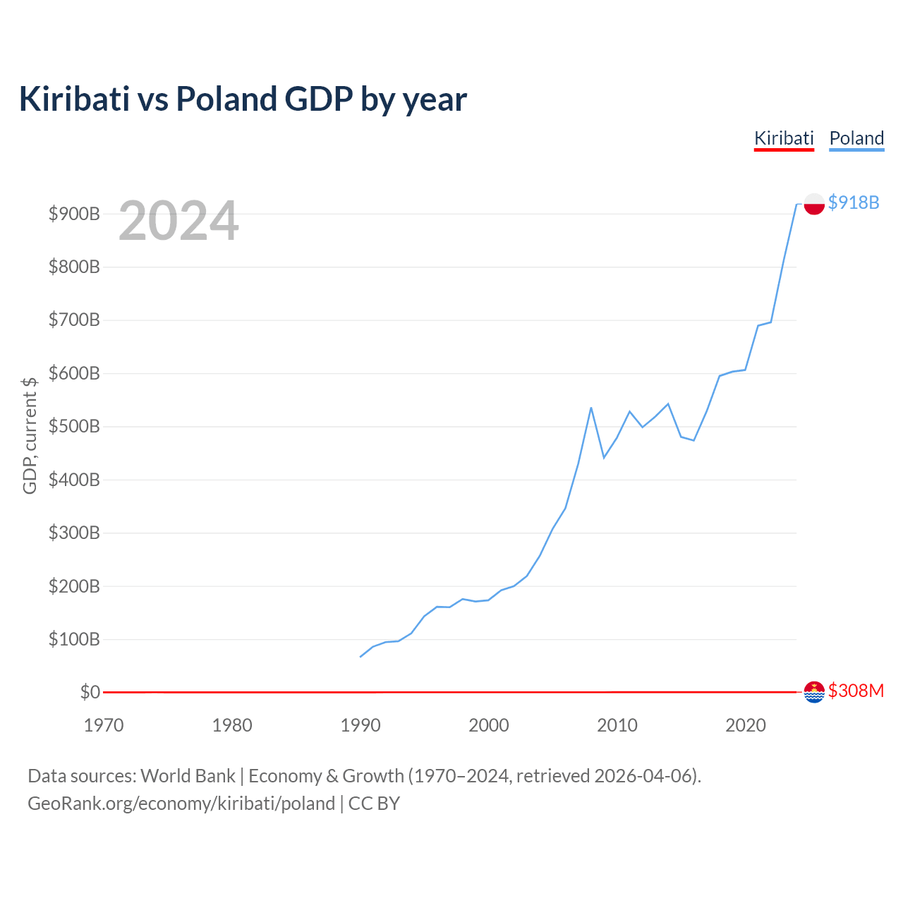 Kiribati has a GDP of $308M compared to $918B for Poland, ranking 192/197 and 21/197 by economy size, respectively.