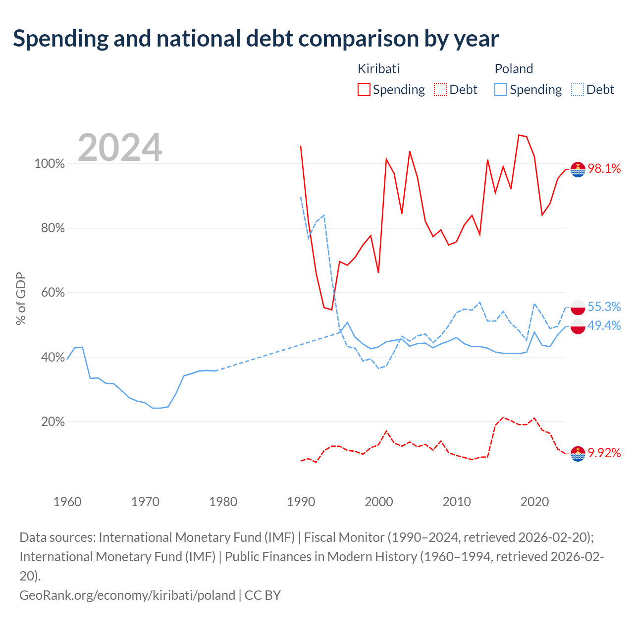 Kiribati has $30.5M in government debt (9.92% of GDP), compared to $507B (55.3% of GDP) in Poland.