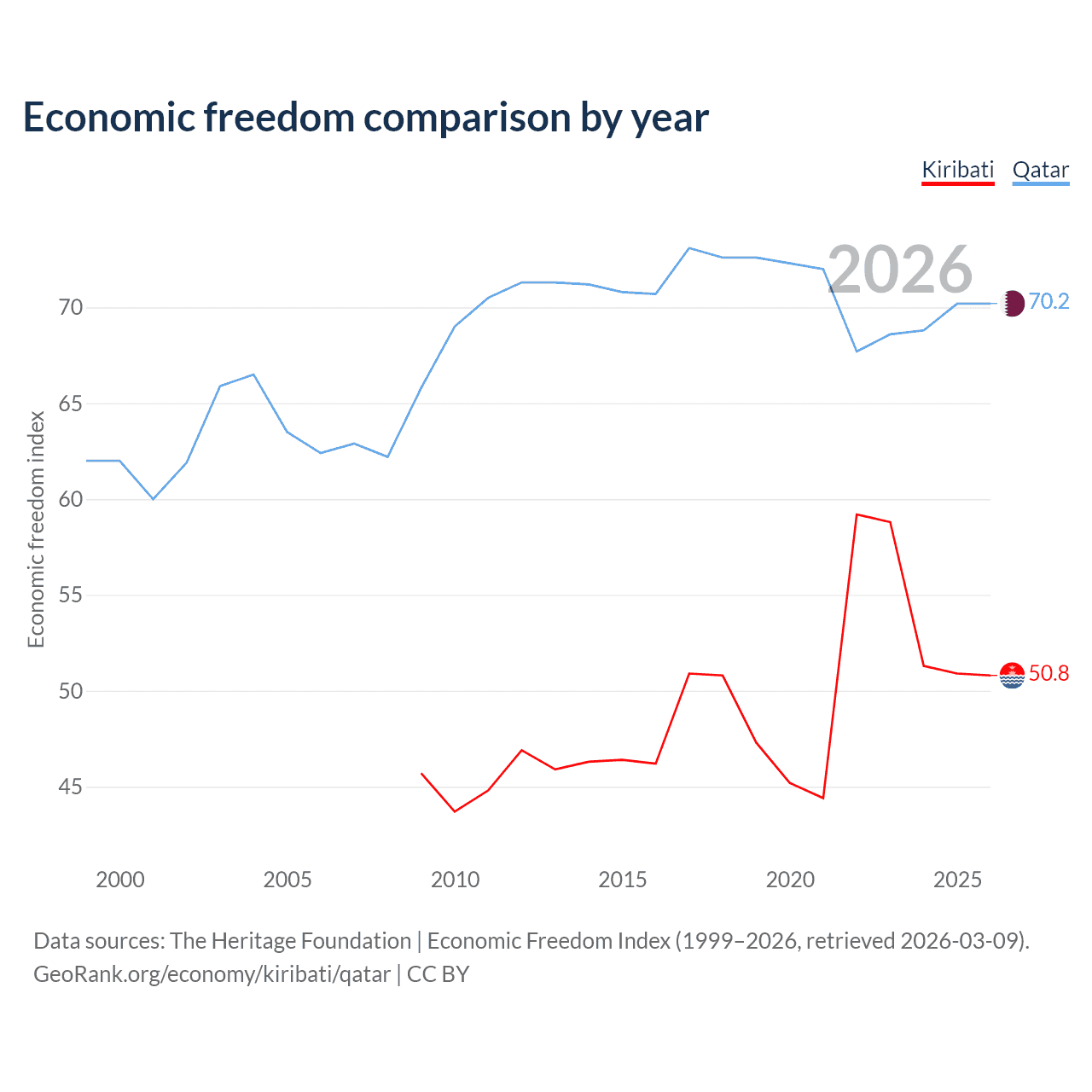 The Economic Freedom Index for Kiribati is 50.8, ranking 158/197, compared to 70.2 for Qatar, ranking 37/197. The chart above displays a comparison of annual changes in economic freedom indexes.
