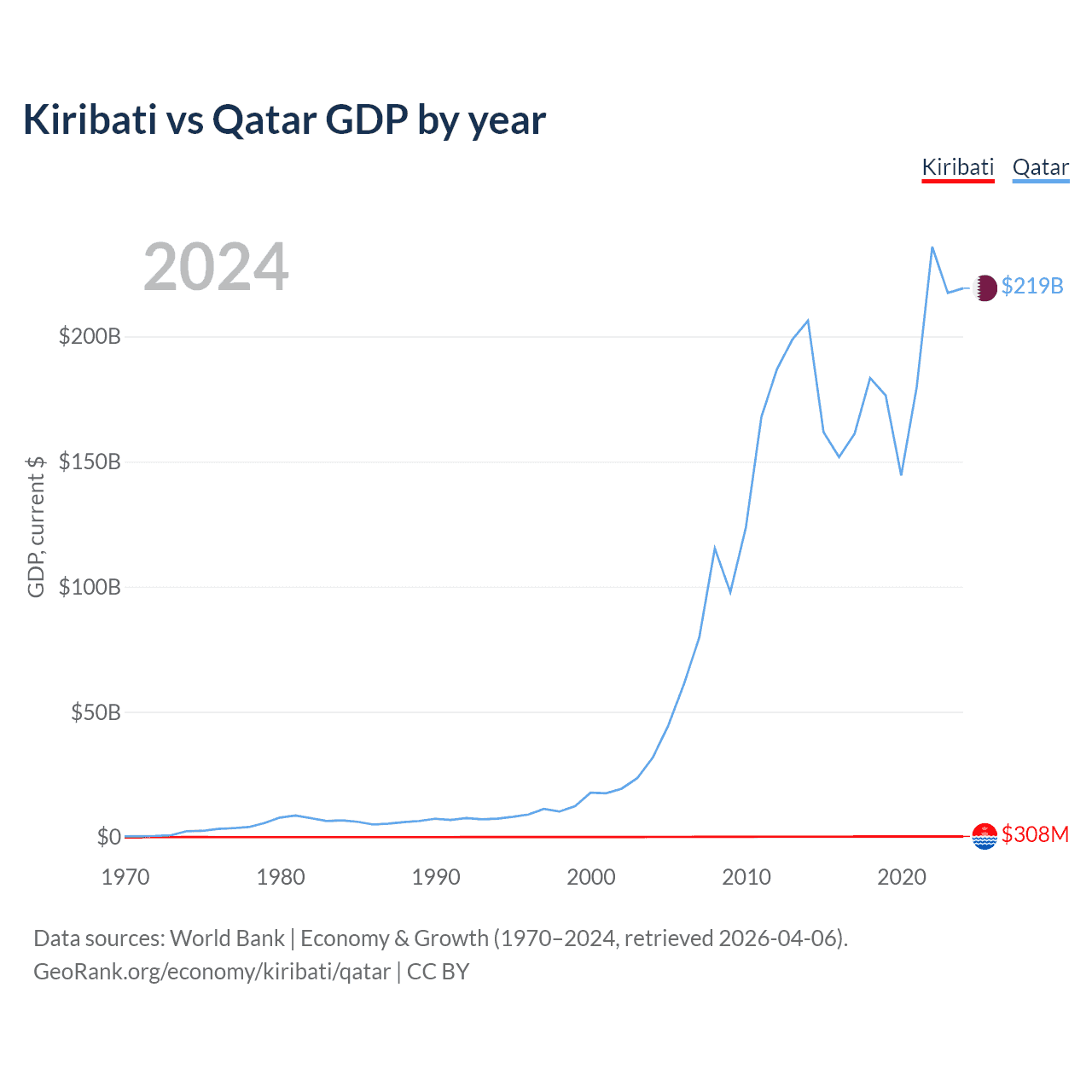 Kiribati has a GDP of $308M compared to $219B for Qatar, ranking 192/197 and 56/197 by economy size, respectively.