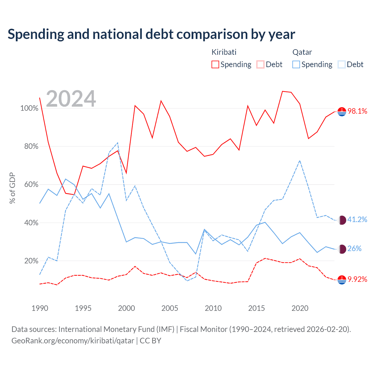 Kiribati has $30.5M in government debt (9.92% of GDP), compared to $90.2B (41.2% of GDP) in Qatar.