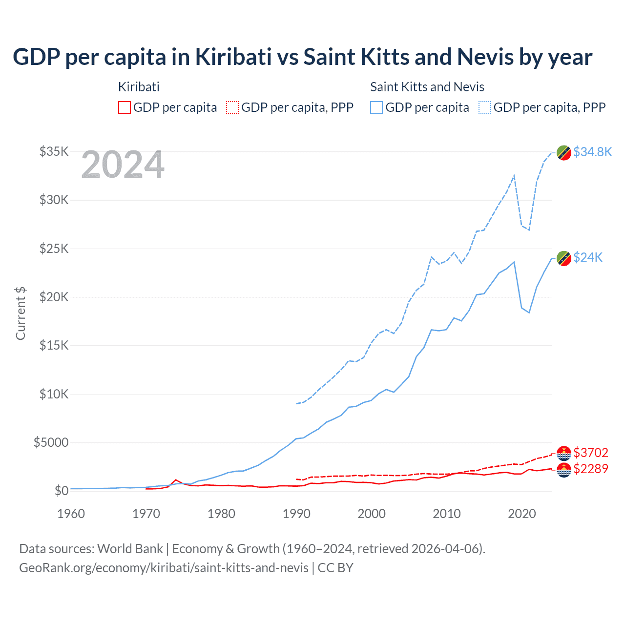 GDP per capita in Kiribati vs Saint Kitts and Nevis by year