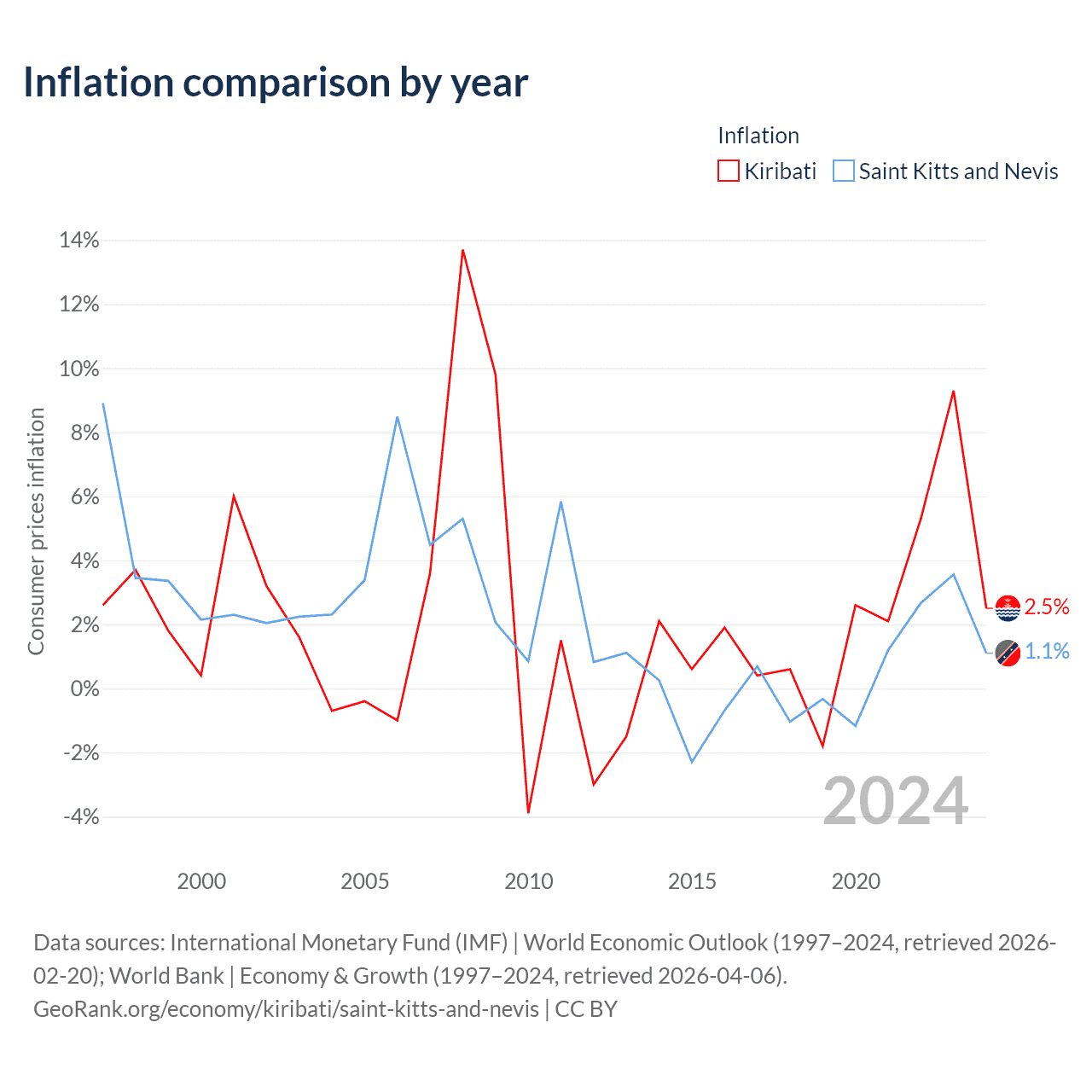 Over the past 28 years, Kiribati has recorded an average annual inflation rate of 2.25%, compared with 2.25% in Saint Kitts and Nevis. In 2024, inflation was 2.5% in Kiribati and 1.1% in Saint Kitts and Nevis.
