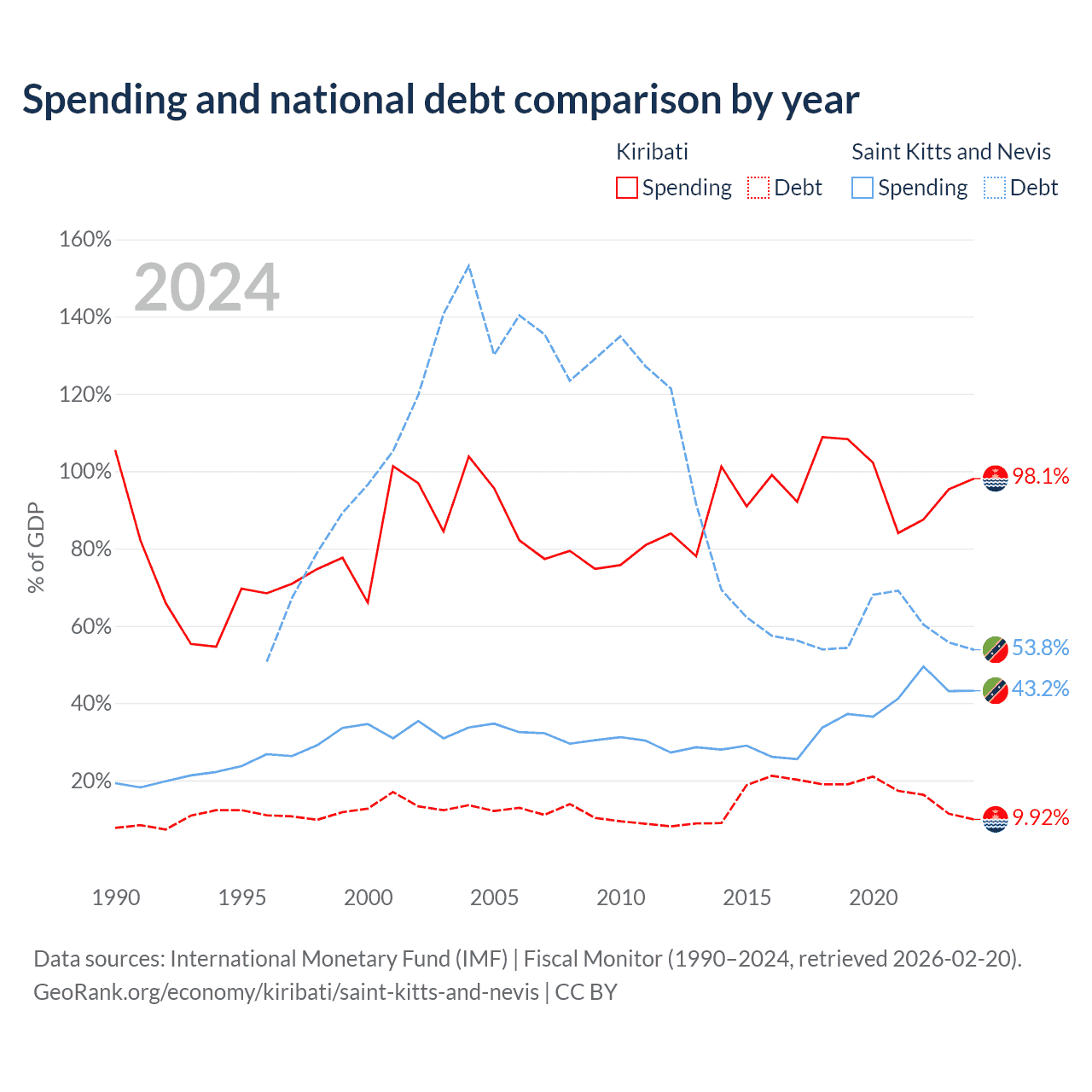 Kiribati has $30.5M in government debt (9.92% of GDP), compared to $604M (53.8% of GDP) in Saint Kitts and Nevis.