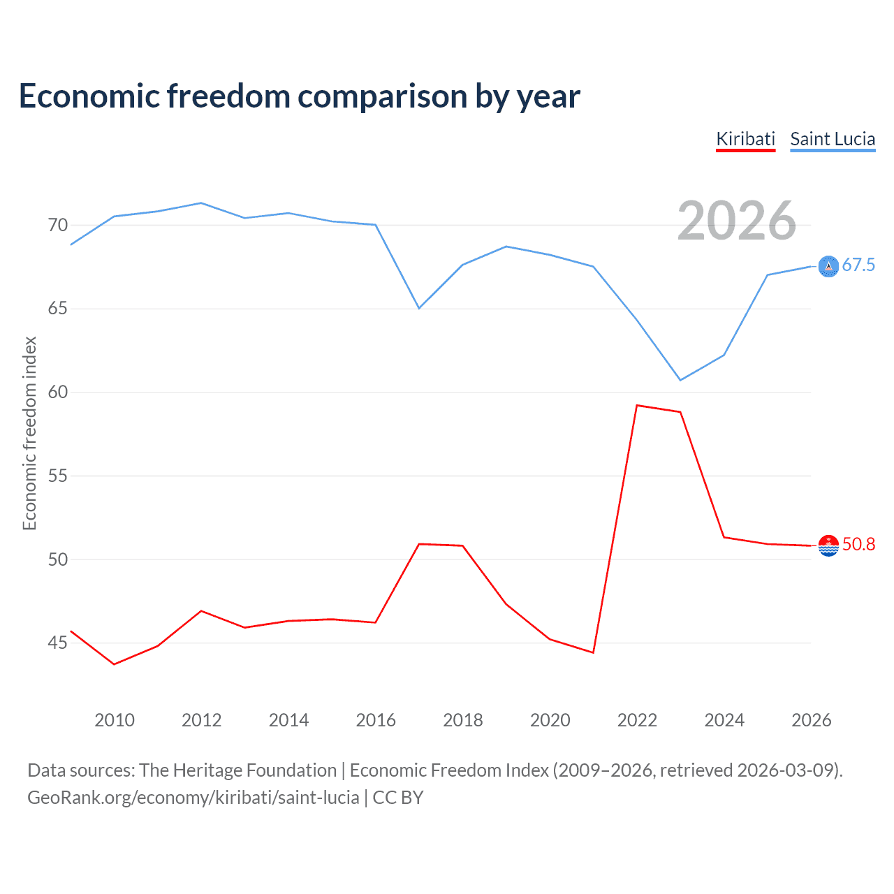 The Economic Freedom Index for Kiribati is 50.8, ranking 158/197, compared to 67.5 for Saint Lucia, ranking 57/197. The chart above displays a comparison of annual changes in economic freedom indexes.