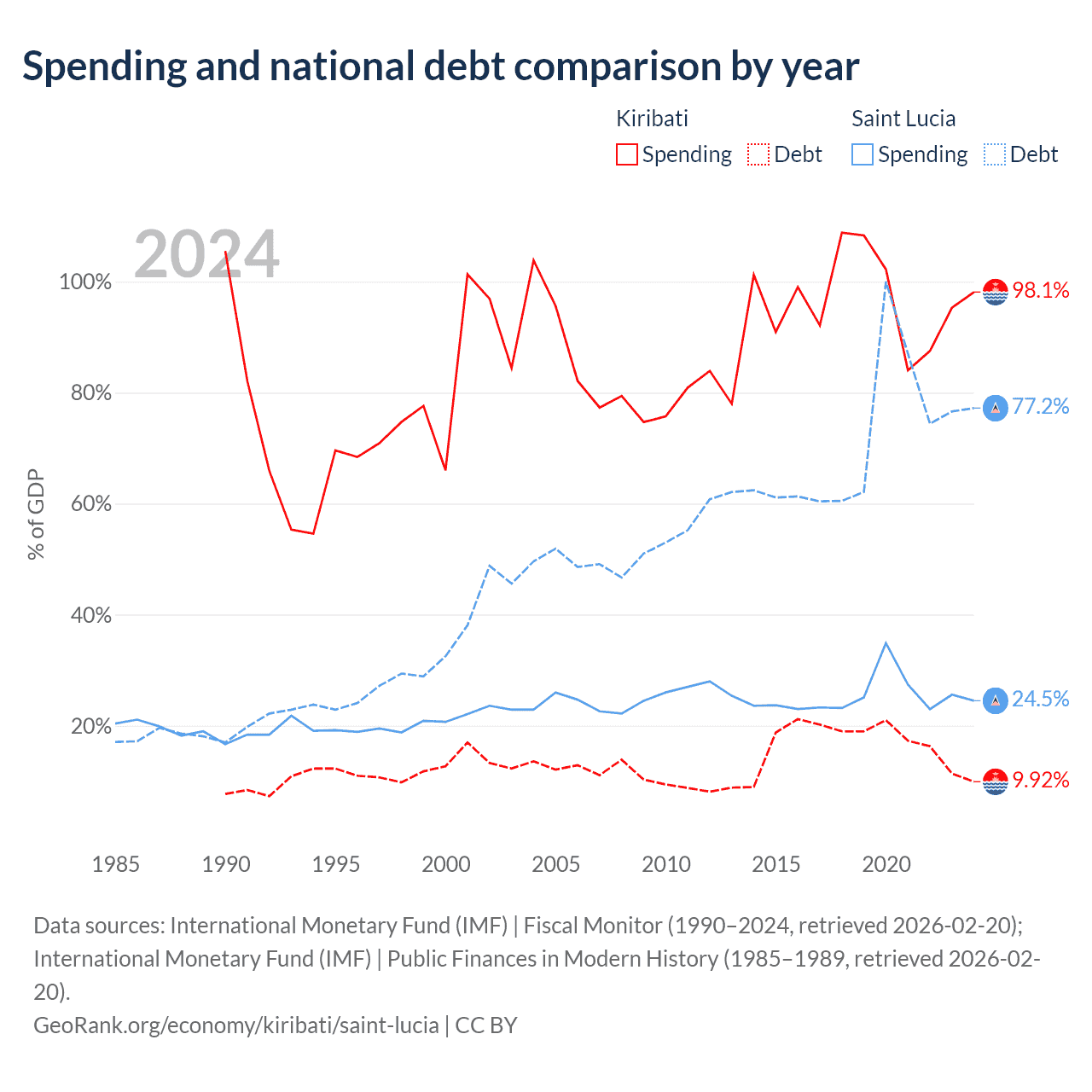 Kiribati has $30.5M in government debt (9.92% of GDP), compared to $1.97B (77.2% of GDP) in Saint Lucia.