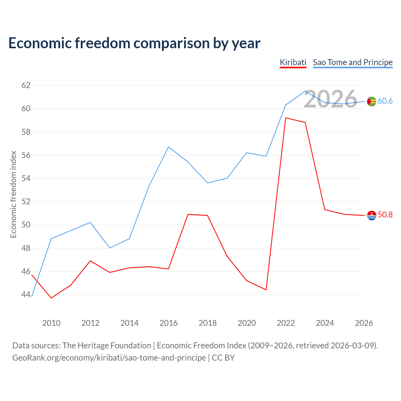 The Economic Freedom Index for Kiribati is 50.8, ranking 158/197, compared to 60.6 for Sao Tome and Principe, ranking 93/197. The chart above displays a comparison of annual changes in economic freedom indexes.