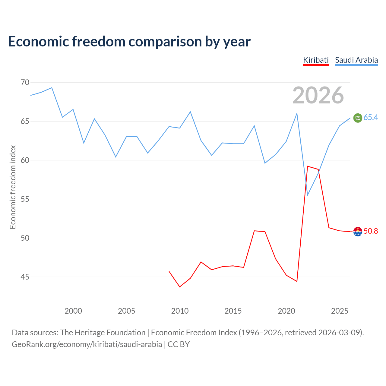 The Economic Freedom Index for Kiribati is 50.8, ranking 158/197, compared to 65.4 for Saudi Arabia, ranking 65/197. The chart above displays a comparison of annual changes in economic freedom indexes.