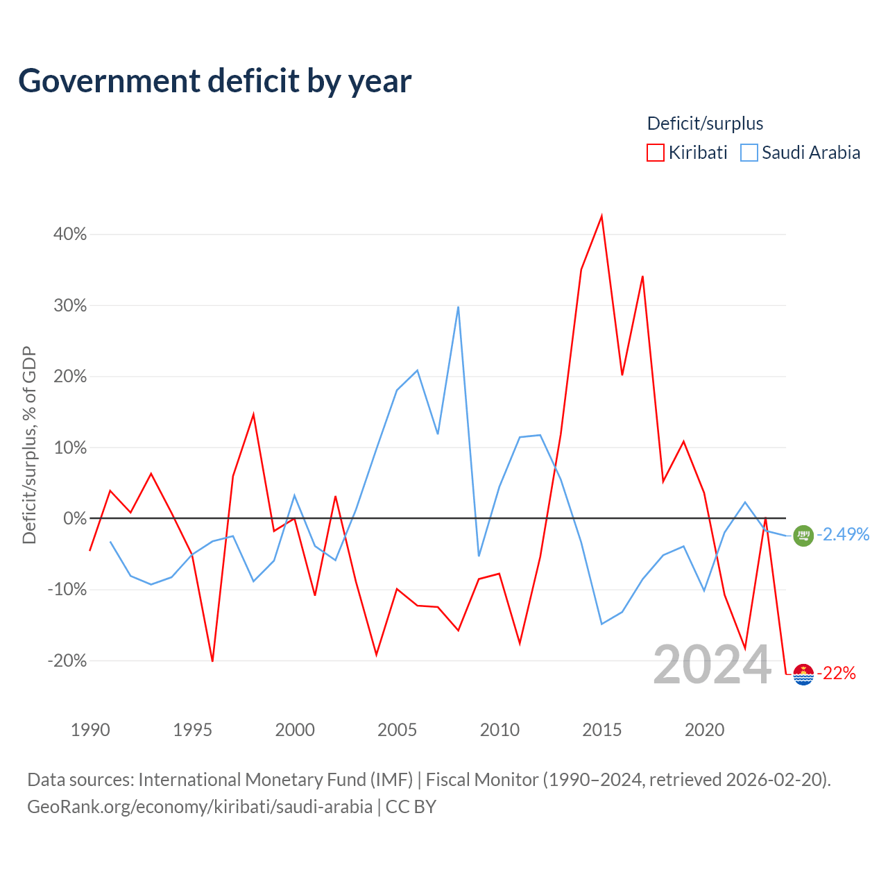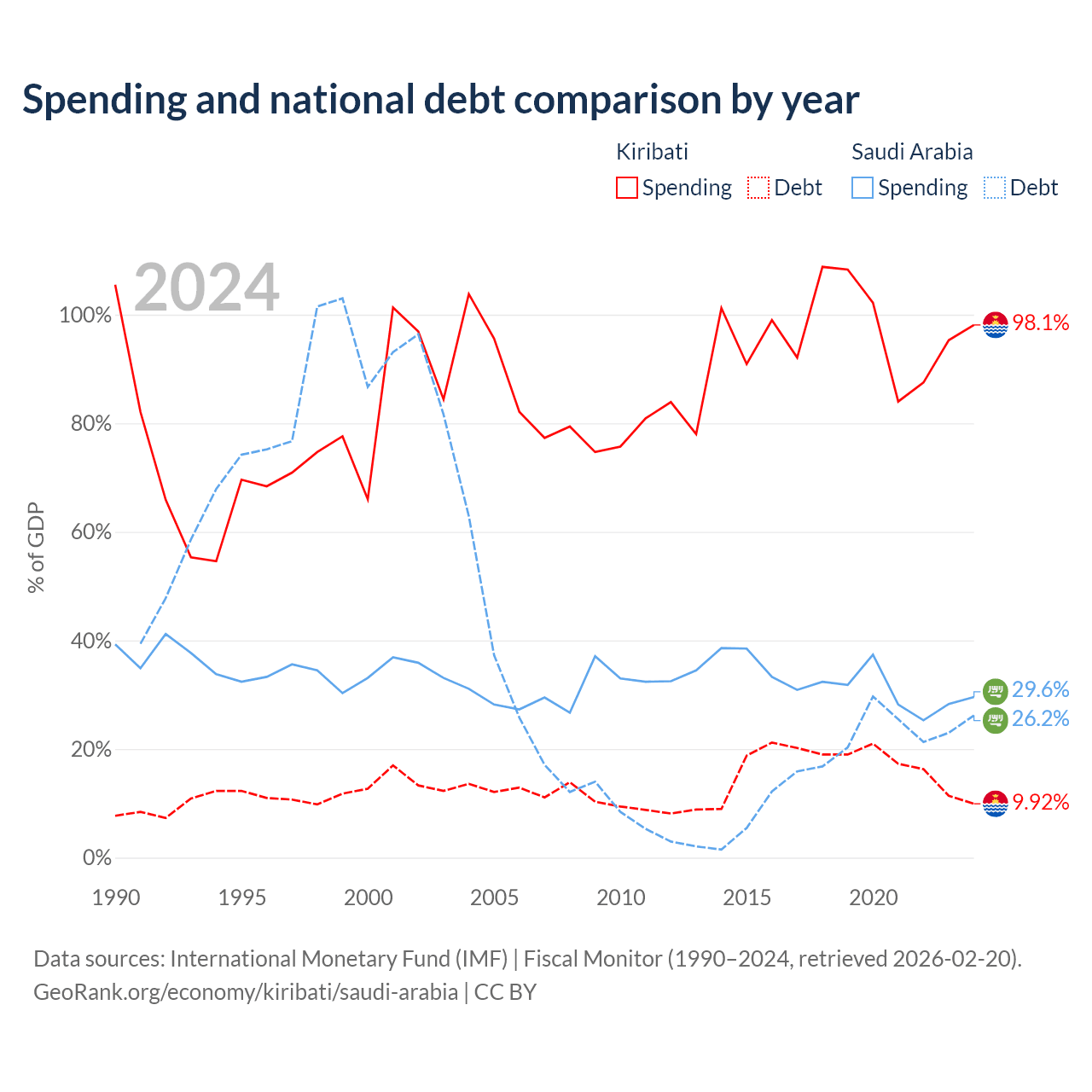 Kiribati has $30.5M in government debt (9.92% of GDP), compared to $324B (26.2% of GDP) in Saudi Arabia.