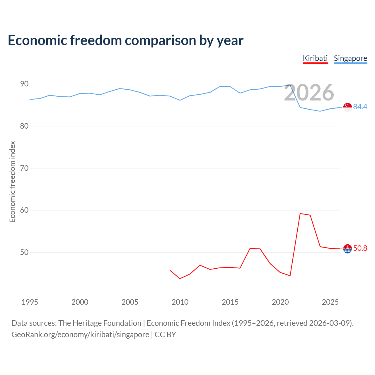 The Economic Freedom Index for Kiribati is 50.8, ranking 158/197, compared to 84.4 for Singapore, ranking 1/197. The chart above displays a comparison of annual changes in economic freedom indexes.