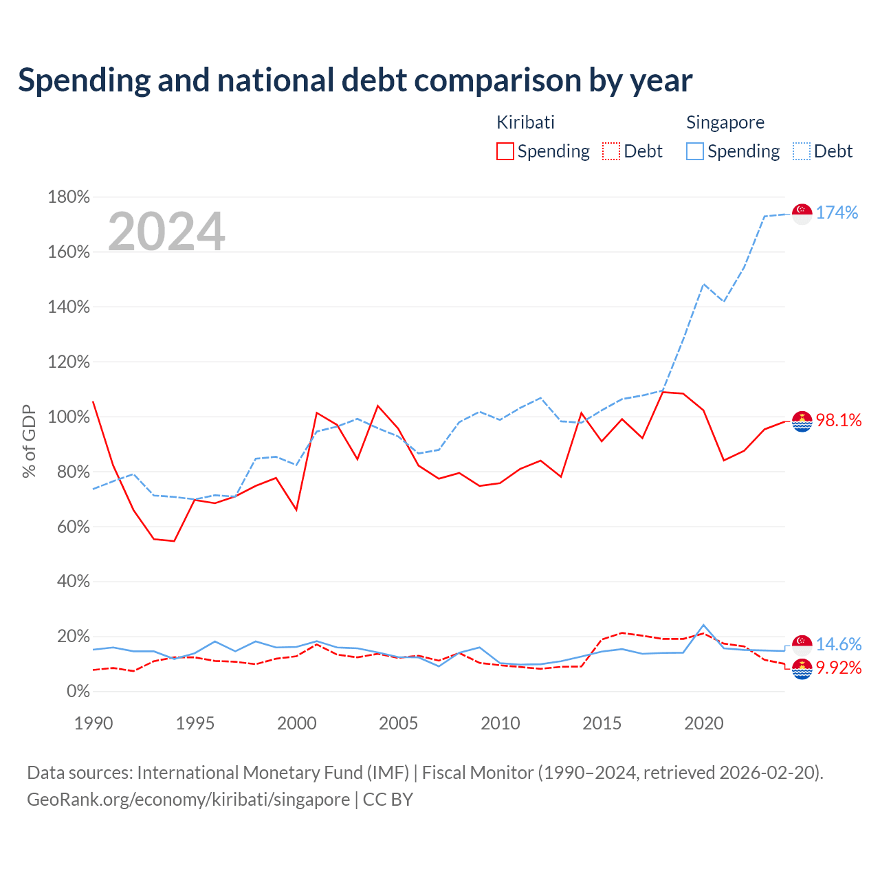 Kiribati has $30.5M in government debt (9.92% of GDP), compared to $950B (173.5% of GDP) in Singapore.