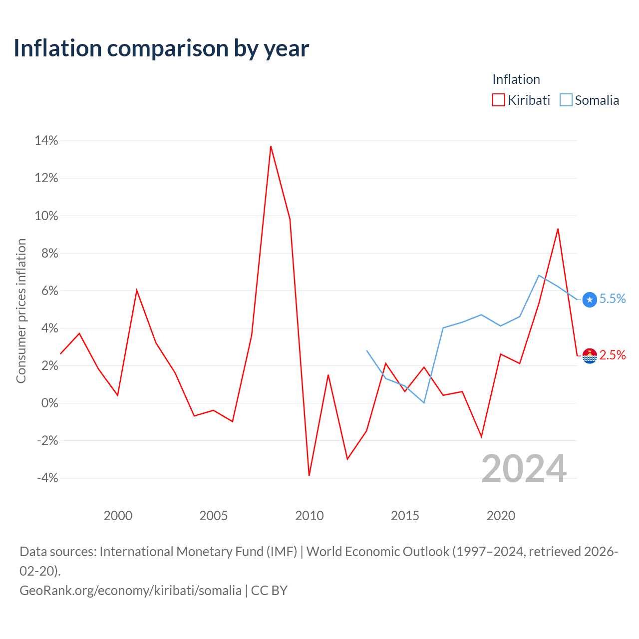 Over the past 12 years, Kiribati has recorded an average annual inflation rate of 2.01%, compared with 3.77% in Somalia. In 2024, inflation was 2.5% in Kiribati and 5.5% in Somalia.