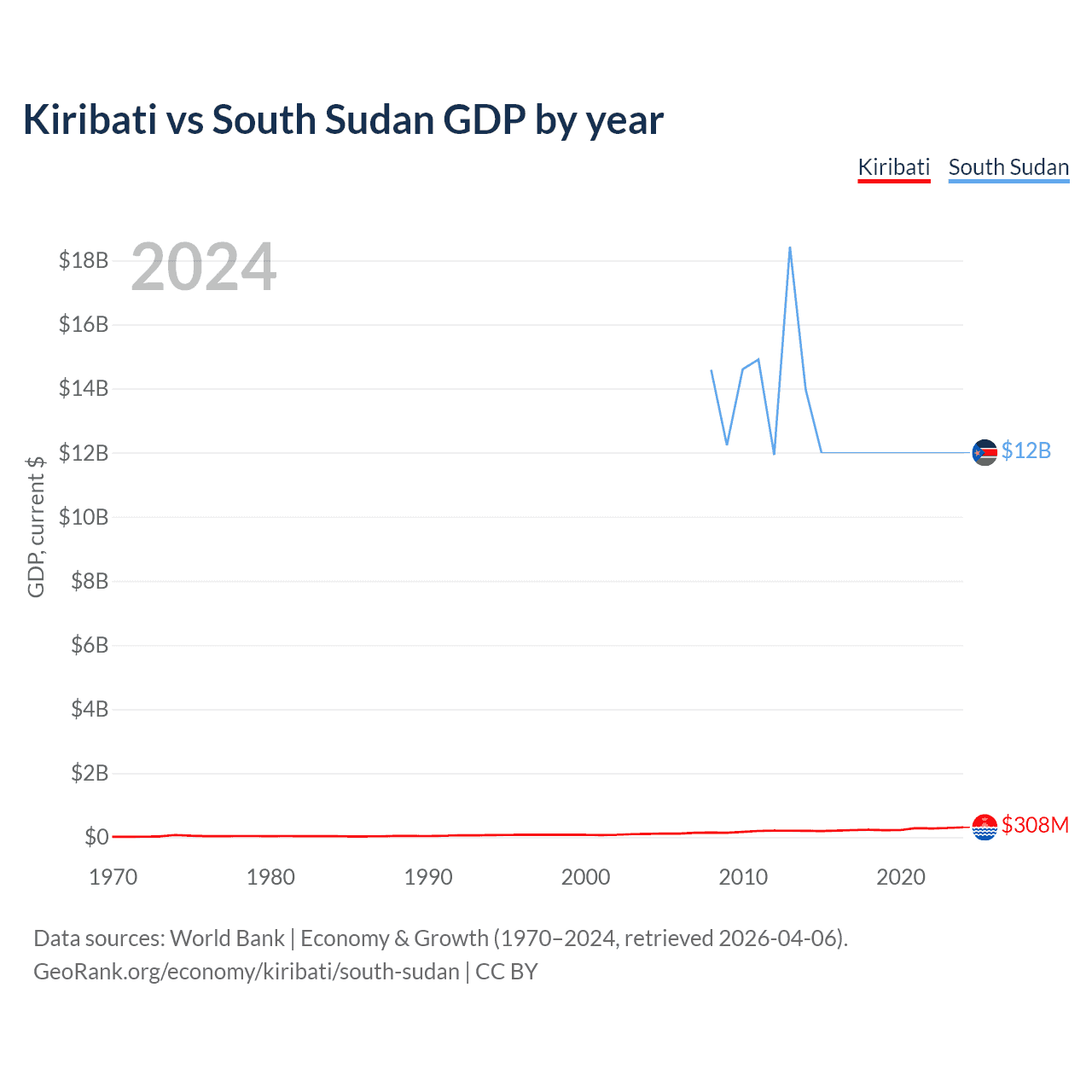 Kiribati has a GDP of $308M compared to $12B for South Sudan, ranking 192/197 and 149/197 by economy size, respectively.