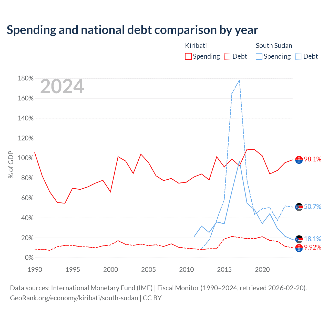 Kiribati has $30.5M in government debt (9.92% of GDP), compared to $7.04B (50.7% of GDP) in South Sudan.