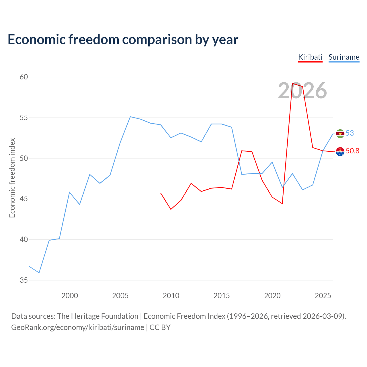 The Economic Freedom Index for Kiribati is 50.8, ranking 158/197, compared to 53 for Suriname, ranking 143/197. The chart above displays a comparison of annual changes in economic freedom indexes.