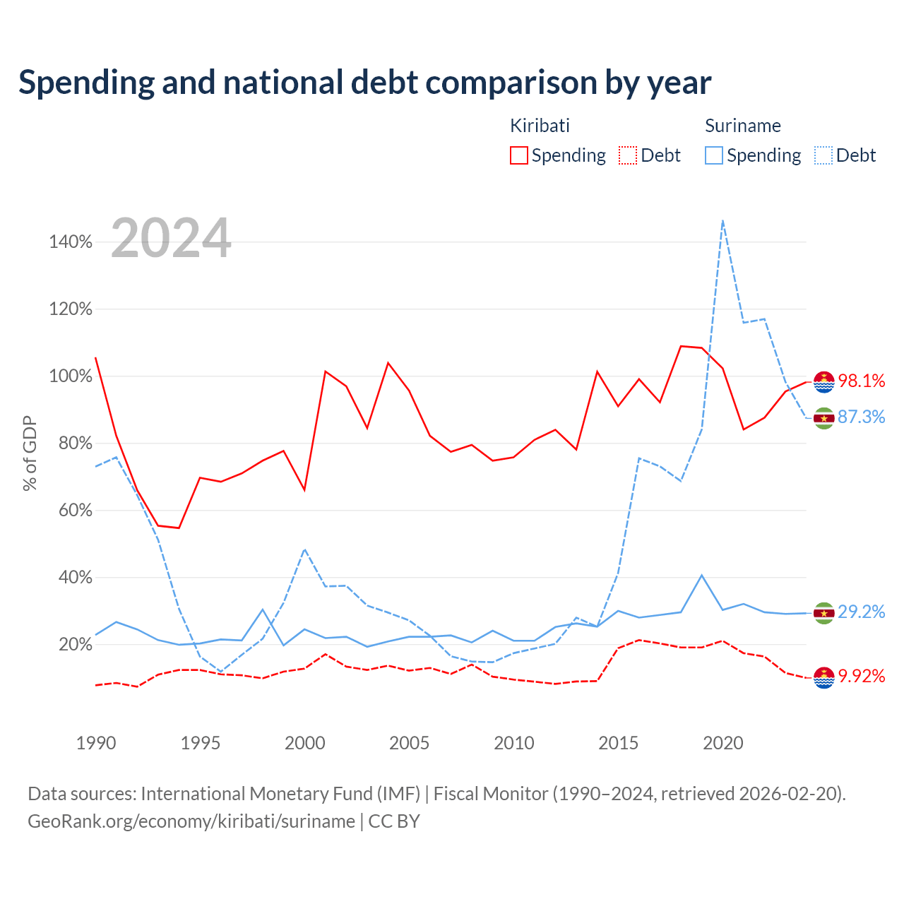 Kiribati has $30.5M in government debt (9.92% of GDP), compared to $3.86B (87.3% of GDP) in Suriname.
