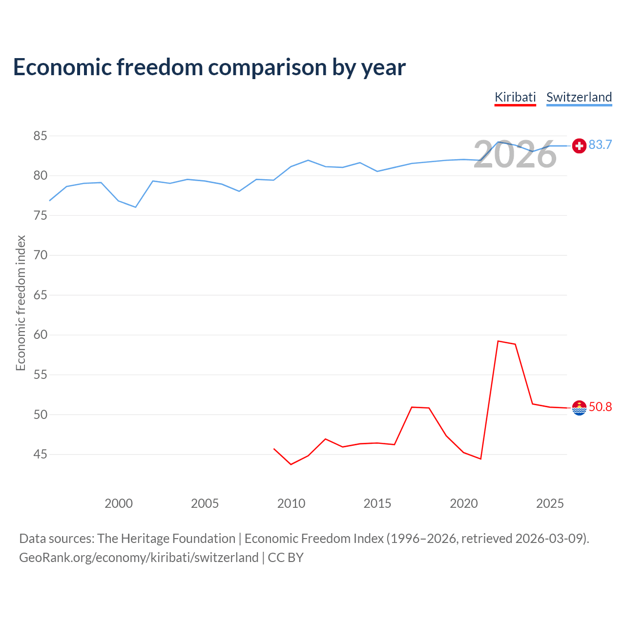 The Economic Freedom Index for Kiribati is 50.8, ranking 158/197, compared to 83.7 for Switzerland, ranking 2/197. The chart above displays a comparison of annual changes in economic freedom indexes.