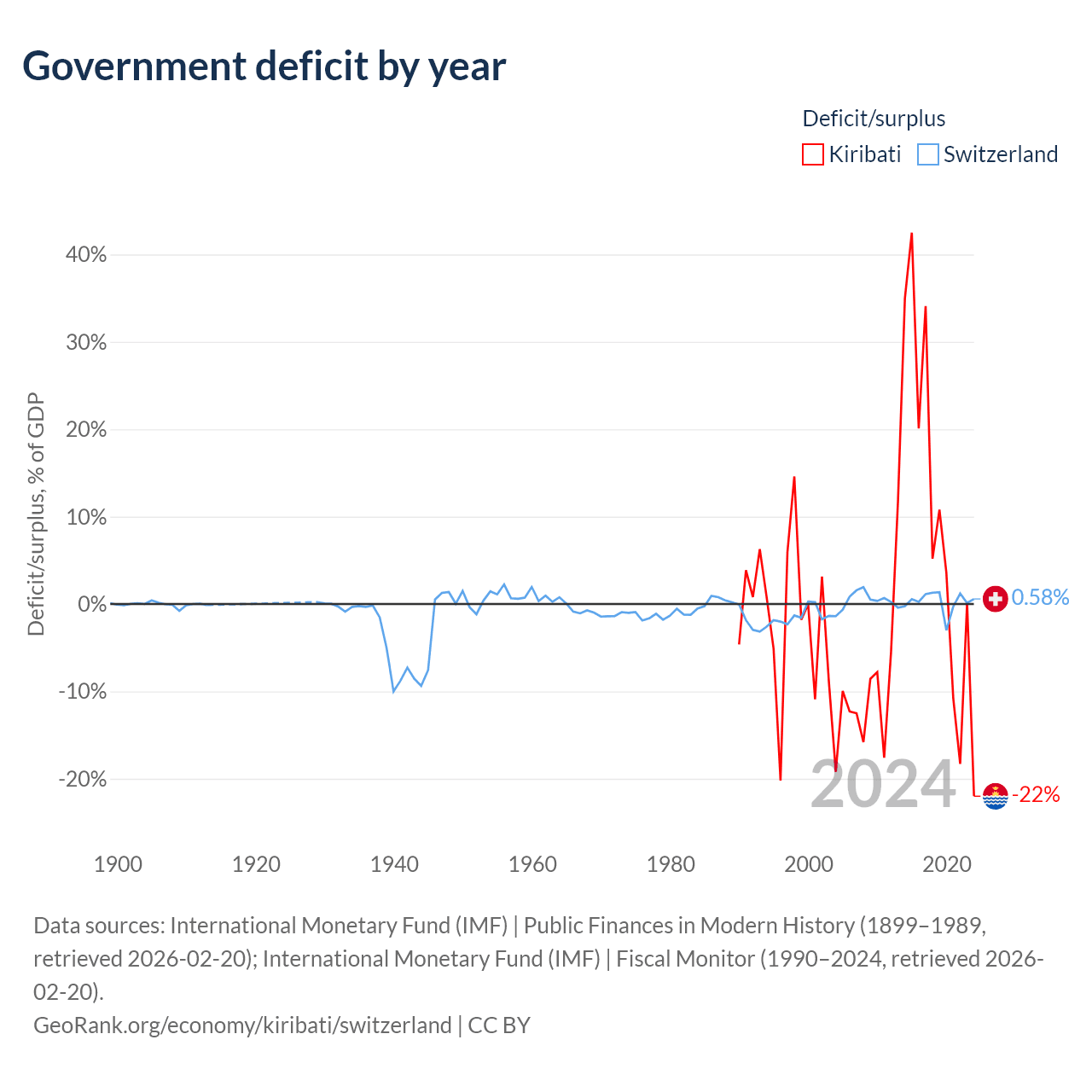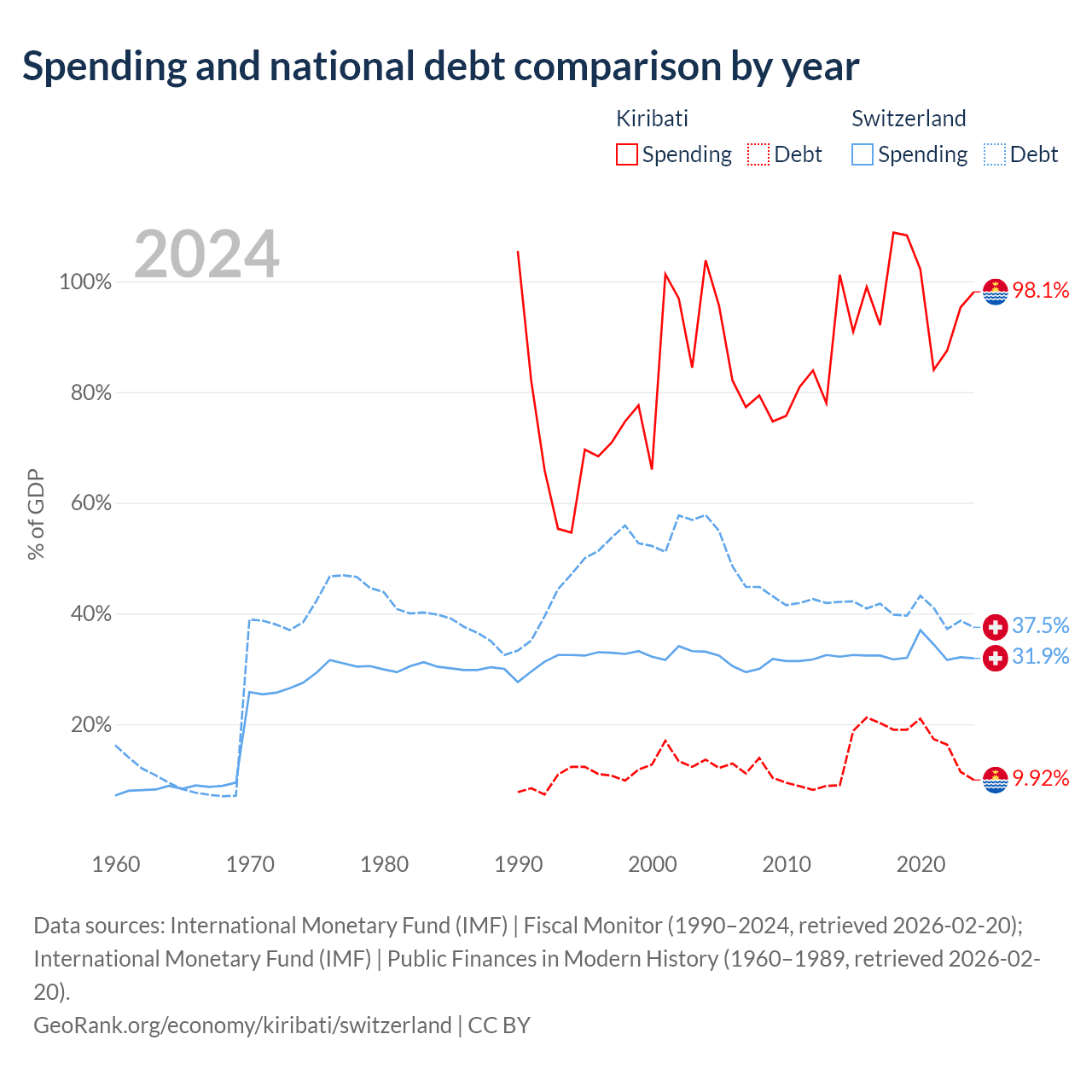 Kiribati has $30.5M in government debt (9.92% of GDP), compared to $351B (37.5% of GDP) in Switzerland.