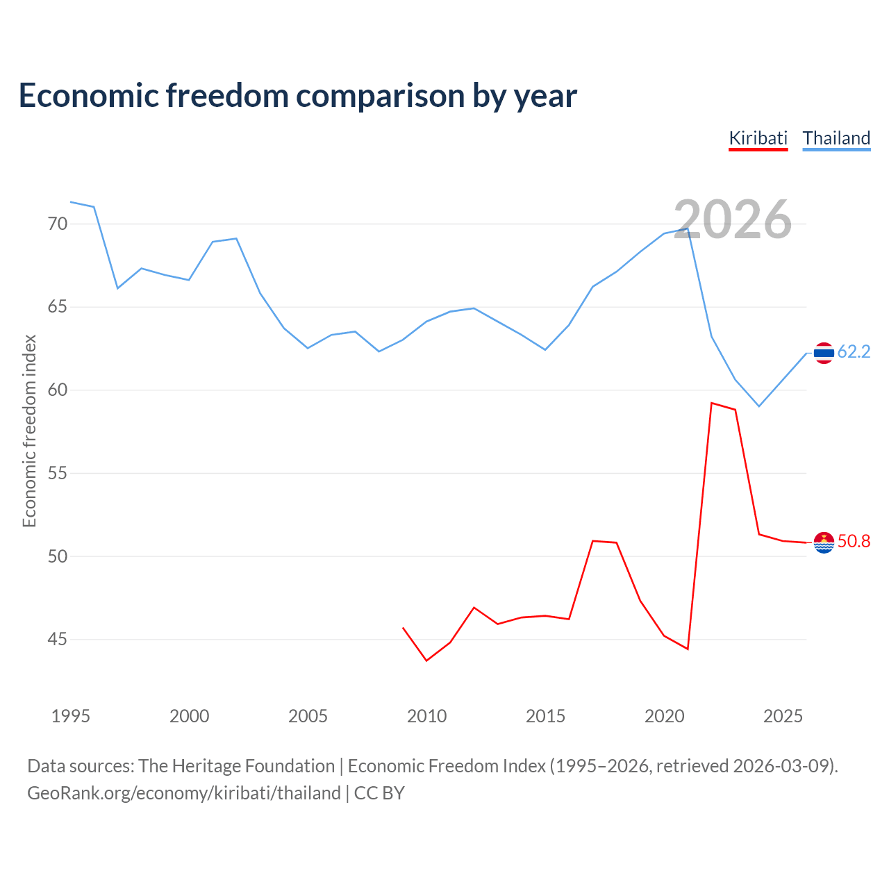 The Economic Freedom Index for Kiribati is 50.8, ranking 158/197, compared to 62.2 for Thailand, ranking 88/197. The chart above displays a comparison of annual changes in economic freedom indexes.