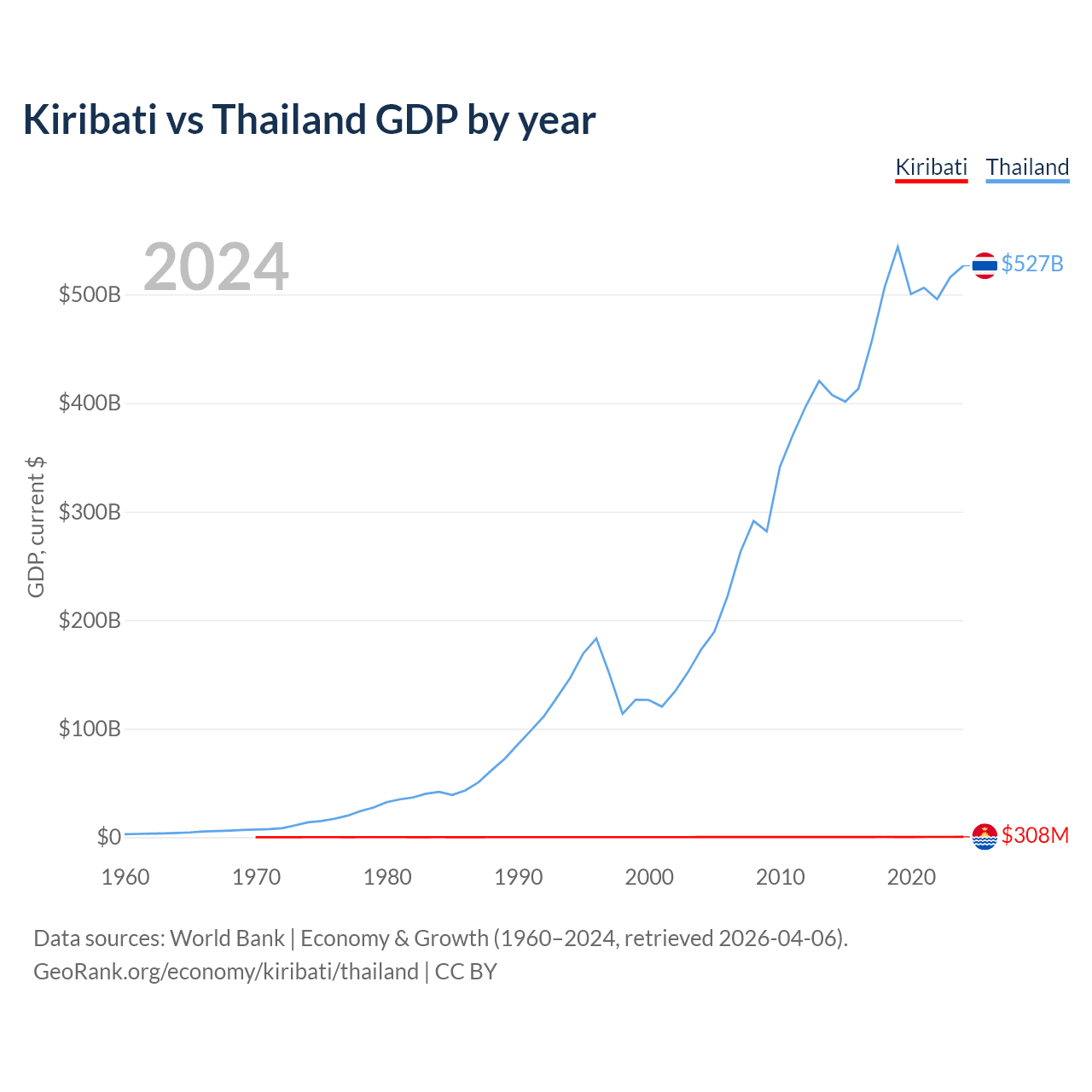 Kiribati has a GDP of $308M compared to $527B for Thailand, ranking 192/197 and 31/197 by economy size, respectively.