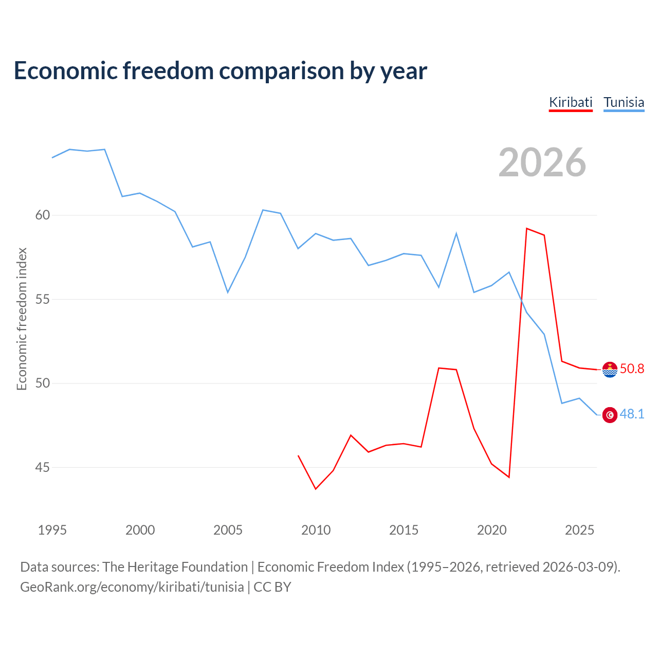 The Economic Freedom Index for Kiribati is 50.8, ranking 158/197, compared to 48.1 for Tunisia, ranking 172/197. The chart above displays a comparison of annual changes in economic freedom indexes.