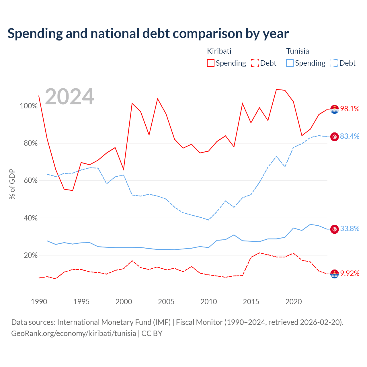 Kiribati has $30.5M in government debt (9.92% of GDP), compared to $42.8B (83.4% of GDP) in Tunisia.
