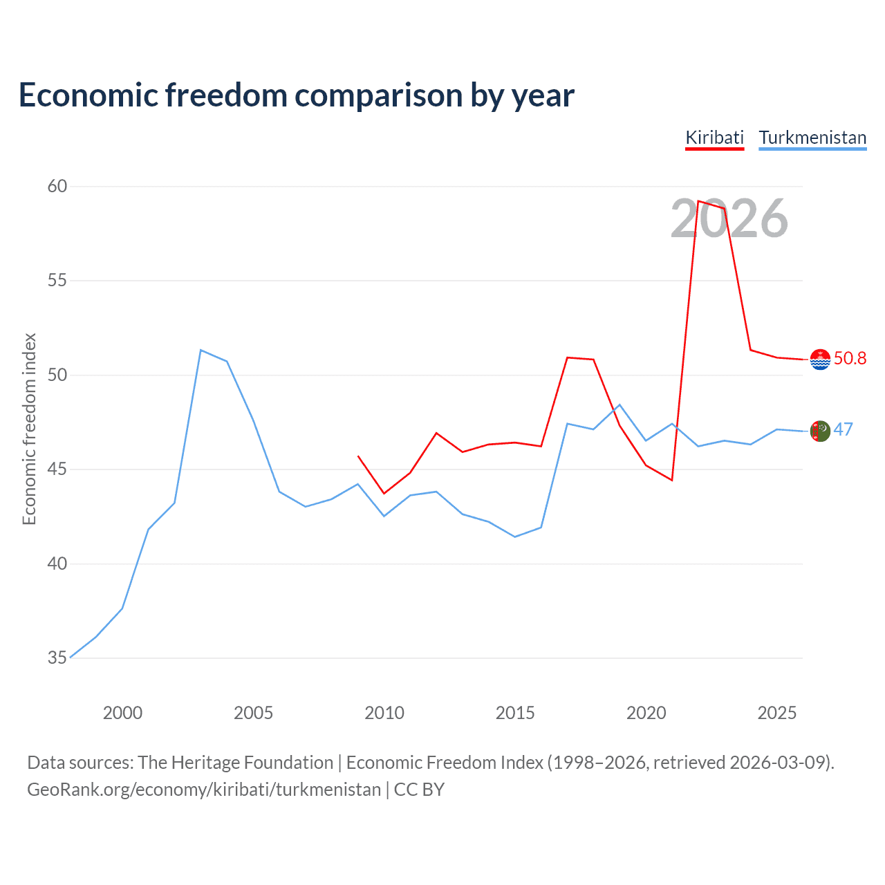 The Economic Freedom Index for Kiribati is 50.8, ranking 158/197, compared to 47 for Turkmenistan, ranking 177/197. The chart above displays a comparison of annual changes in economic freedom indexes.