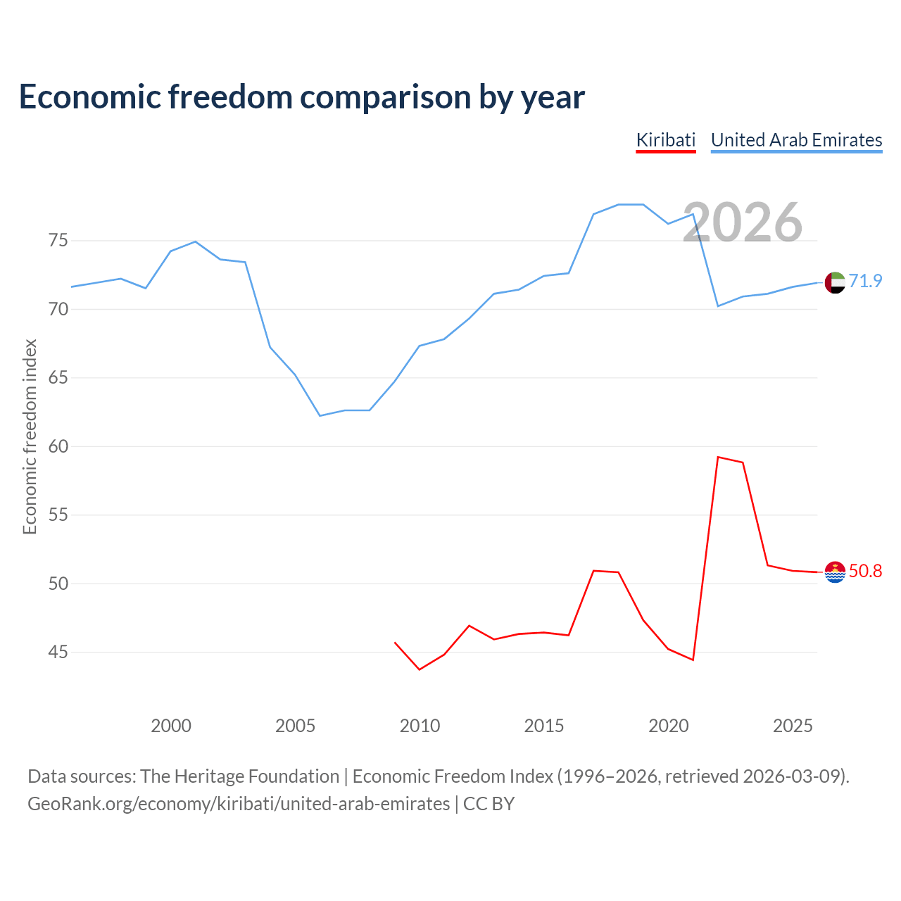 The Economic Freedom Index for Kiribati is 50.8, ranking 158/197, compared to 71.9 for the United Arab Emirates, ranking 29/197. The chart above displays a comparison of annual changes in economic freedom indexes.