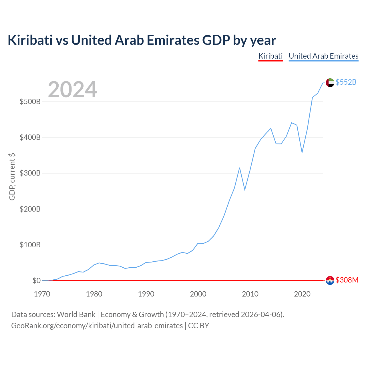 Kiribati has a GDP of $308M compared to $552B for the United Arab Emirates, ranking 192/197 and 27/197 by economy size, respectively.