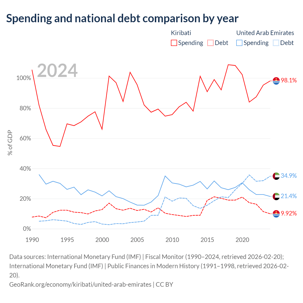 Kiribati has $30.5M in government debt (9.92% of GDP), compared to $193B (34.9% of GDP) in the United Arab Emirates.